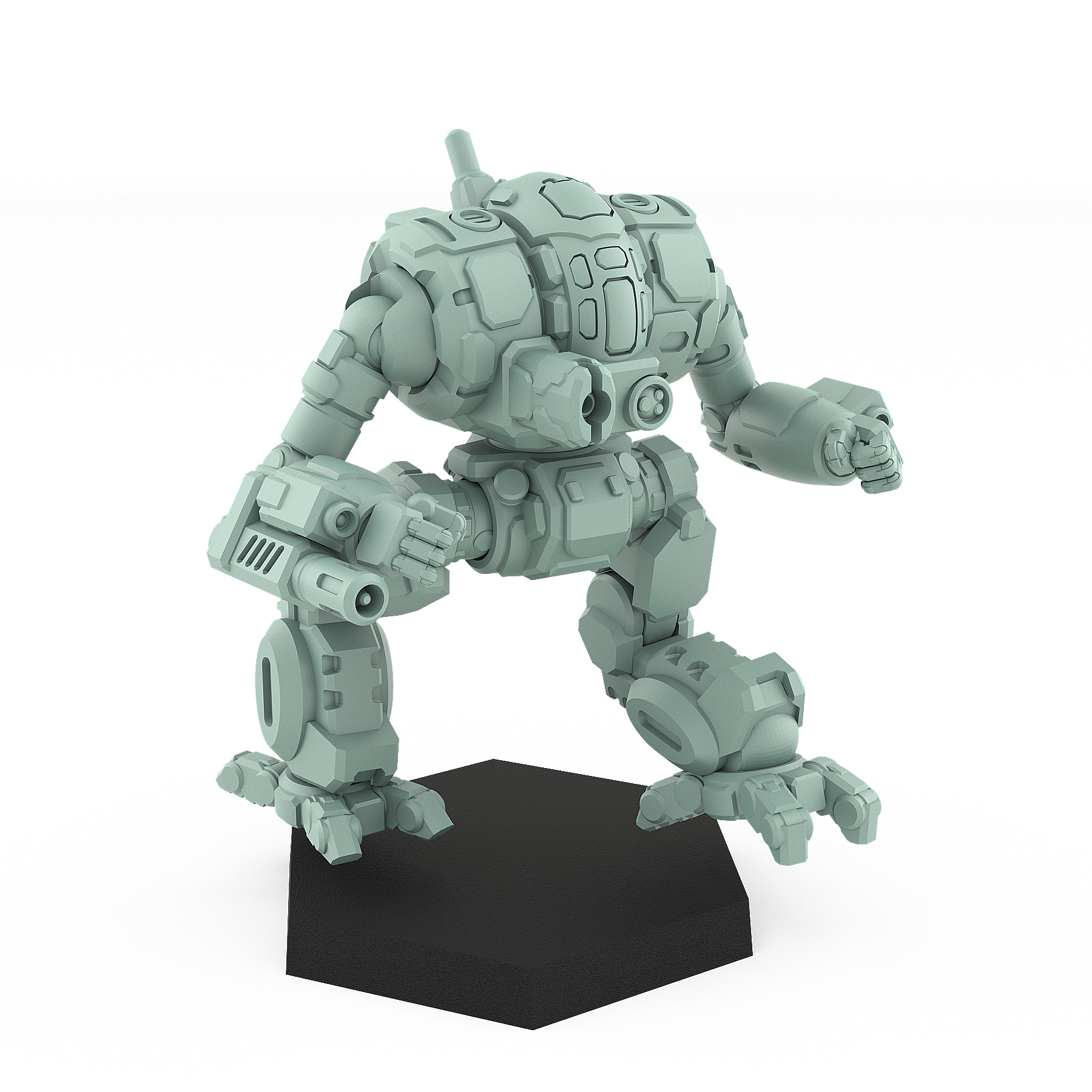 Cezar 3R advances through the war-torn landscape, its heavy footfalls echoing the promise of destruction. This mech is armed with a pair of devastating arm-mounted cannons, designed for both close-quarters skirmishes and long-range engagements. As a frontline combatant, it excels in drawing enemy fire while delivering punishing strikes. Originating from a lineage of robust designs, the Cezar 3R has become a symbol of resilience and power in the mech community. With its imposing silhouette and relentless firepower, it commands respect and fear on the battlefield, a true testament to its legacy.