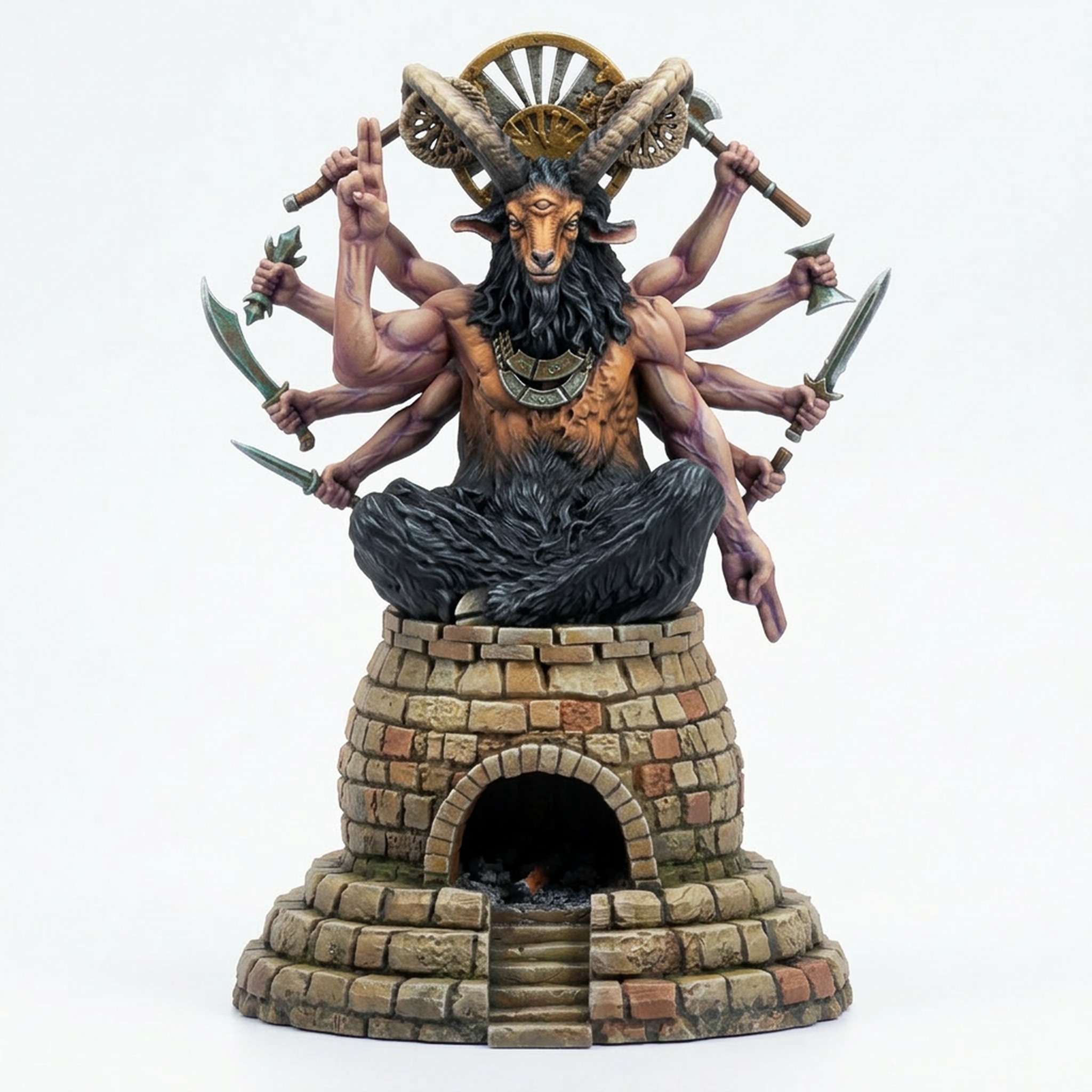 Bring an element of ancient, dark worship to your tabletop encounters with the Altar of Maleshi from Mammoth Factory’s ‘Land of the Blind’ collection. This highly detailed miniature features a stylized, horned figure representing Maleshi, seated atop a crumbling, brickwork altar base. Its unique baphomet-like appearance, holding a cylindrical artifact, makes it a striking center piece for cultist hideouts or ancient ruins. The sculpt boasts intricate textures from the aged stone work to the organic form of the seated deity.