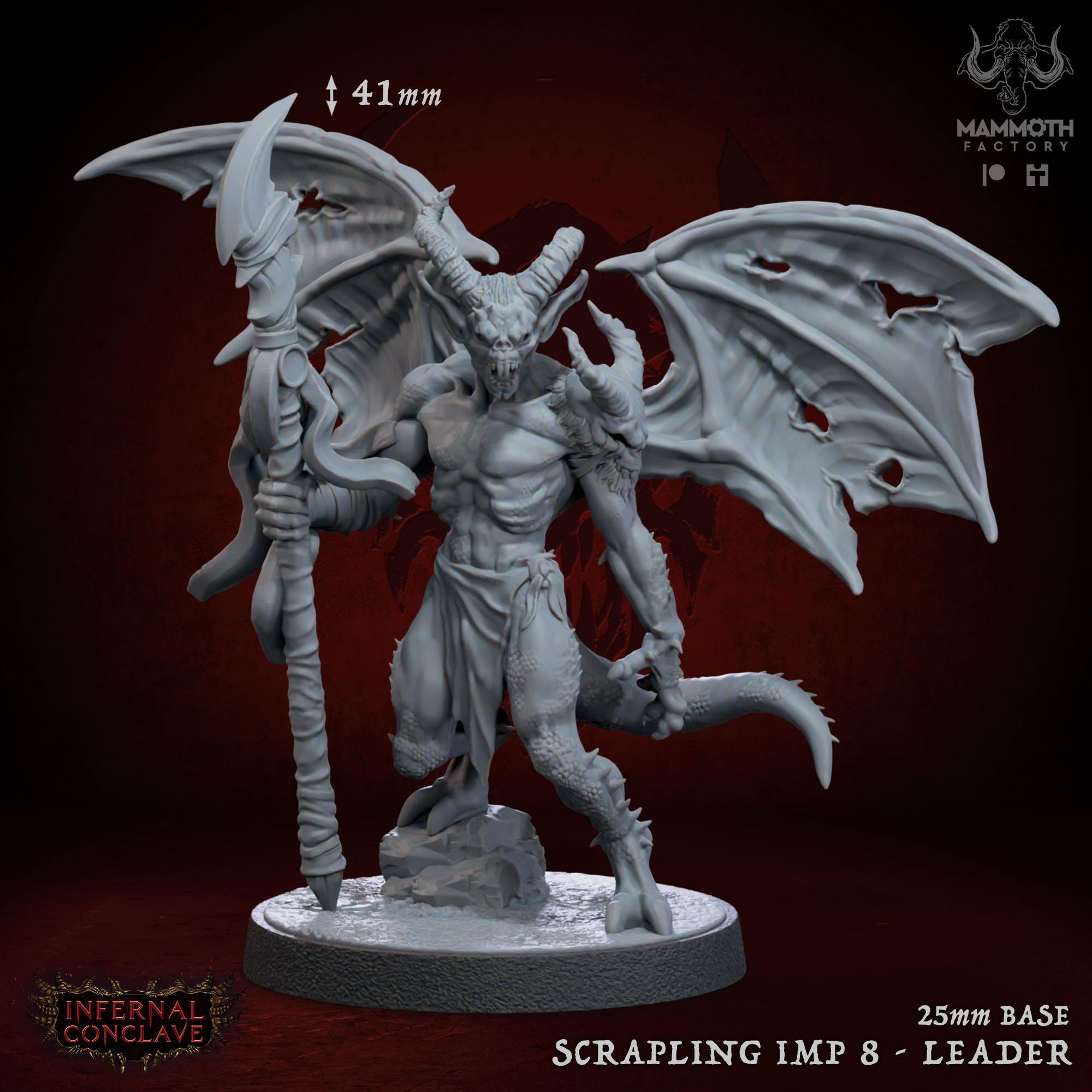 Bring authority and menace to your infernal armies with the Scrapling Imp 8 Leader miniature from Mammoth Factory’s Infernal Conclave collection. This exquisitely detailed sculpt captures the essence of a cunning and powerful minor devil, perfect for leading your hordes of scamps and imps into battle. The model features ragged bat-like wings, a muscled physique, imposing horns, and a wickedly designed staff, marking him as a figure of command within the Nine Hells. Whether he’s a warlock’s formidable familiar or a unique encounter in a devilish dungeon, this Leader demands attention on the tabletop.
