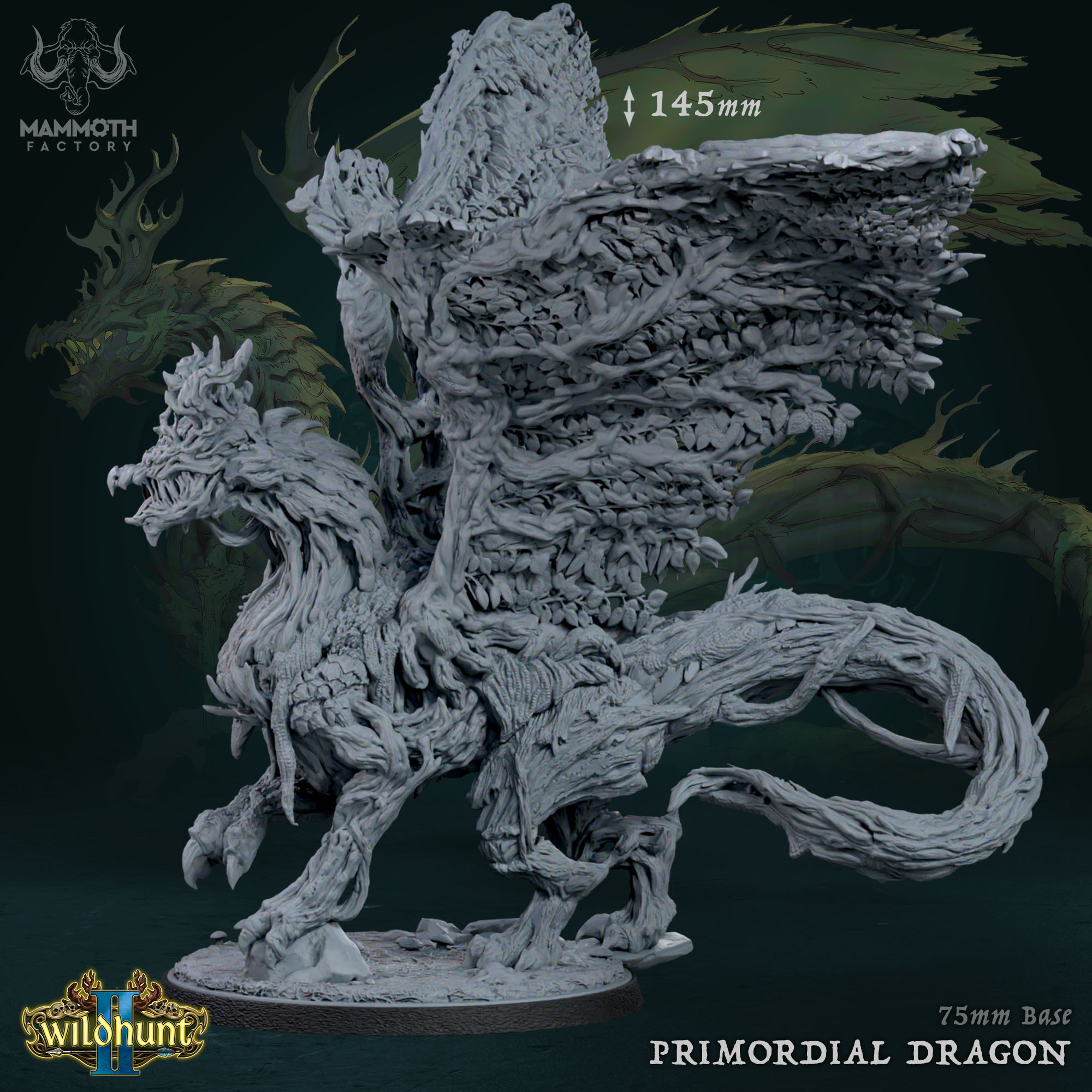 Unleash the primal force of nature on your tabletop with the Primordial Dragon from Mammoth Factory’s Wild Hunt 2 collection. This is not just a dragon; it is an embodiment of the ancient forest. The sculpt captures incredible organic detail, with the dragon’s entire body seemingly composed of gnarled wood, vines, and thick foliage. The wings are grand sweeping structures made of interwoven branches and dense leaves, making it a unique and formidable presence in any miniature collection.