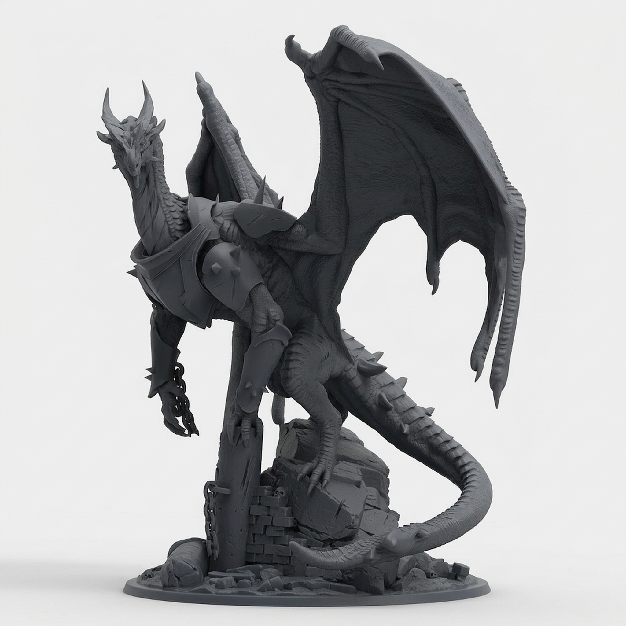 Xeldranth Armor stands as a terrifying fusion of sentience and steel, an armored draconic titan that embodies both ancient might and arcane cruelty. This centerpiece from the Unchained Collection presents a fearsome dragon clad in jagged, rune-etched plates of war-forged armor. Towering upon a detailed base of cracked stone and fallen skulls, it’s a vision of dominance and dread. With an upright, commanding pose and wings unfurled to shadow the battlefield, Xeldranth is ready to impose his will upon any foe. Every detail—from the horned helm to the clawed gauntlets and the barbed tail—has been sculpted for maximum presence at the gaming table or display shelf. This model is ideal as a campaign boss, legendary creature, or imposing dragon general. Whether you’re building a dark fantasy narrative or seeking a jaw-dropping highlight for your collection, Xeldranth Armor delivers the brutal elegance and scale that true dragon lovers crave.