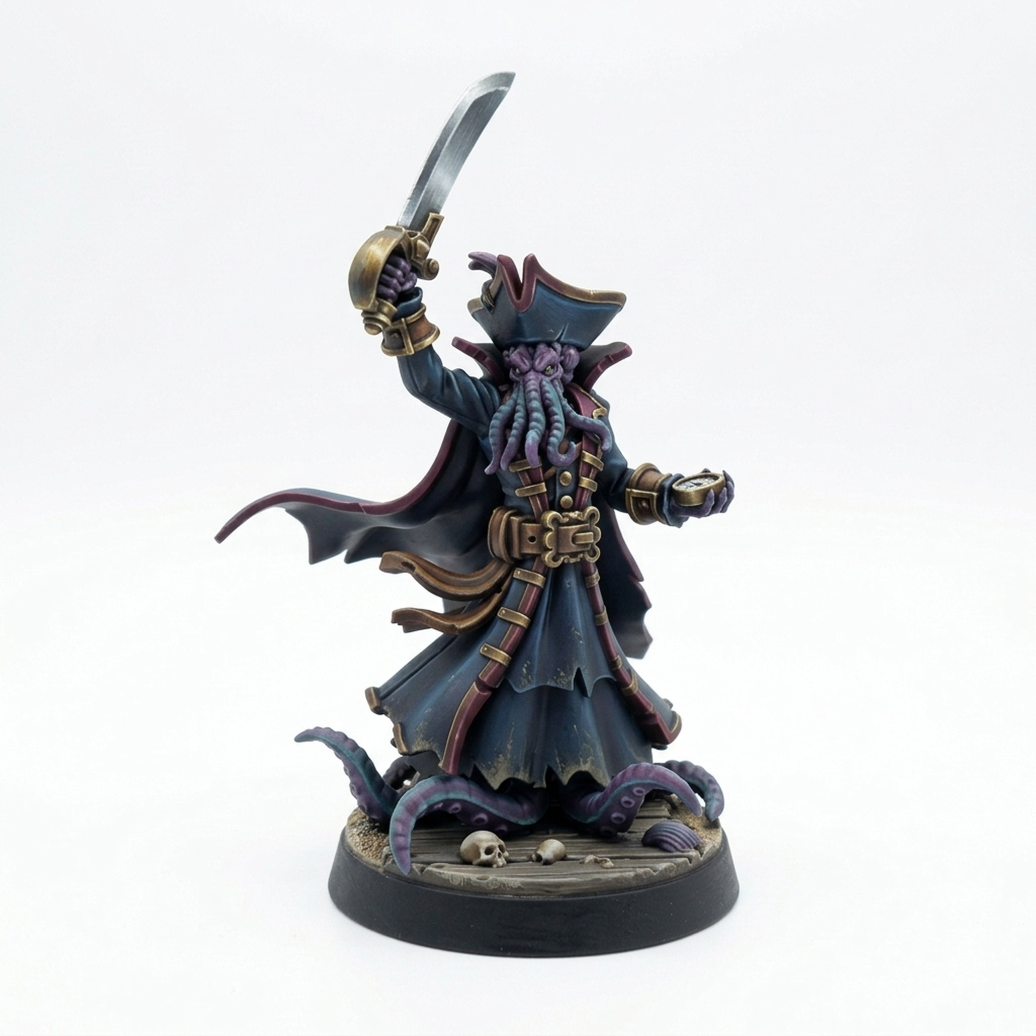 Sculpted with exceptional detail, this miniature captures the Captain's flowing robes, intricate belt buckles, and a striking pirate tricorn hat covering his distinctive tentacled face. Armed with a raised cutlass and holding a compass, Captain Mindhost is ready to lead his crew from the standard 30mm base, complete with subtle tentacle details suggesting his otherworldly nature beneath the deck.