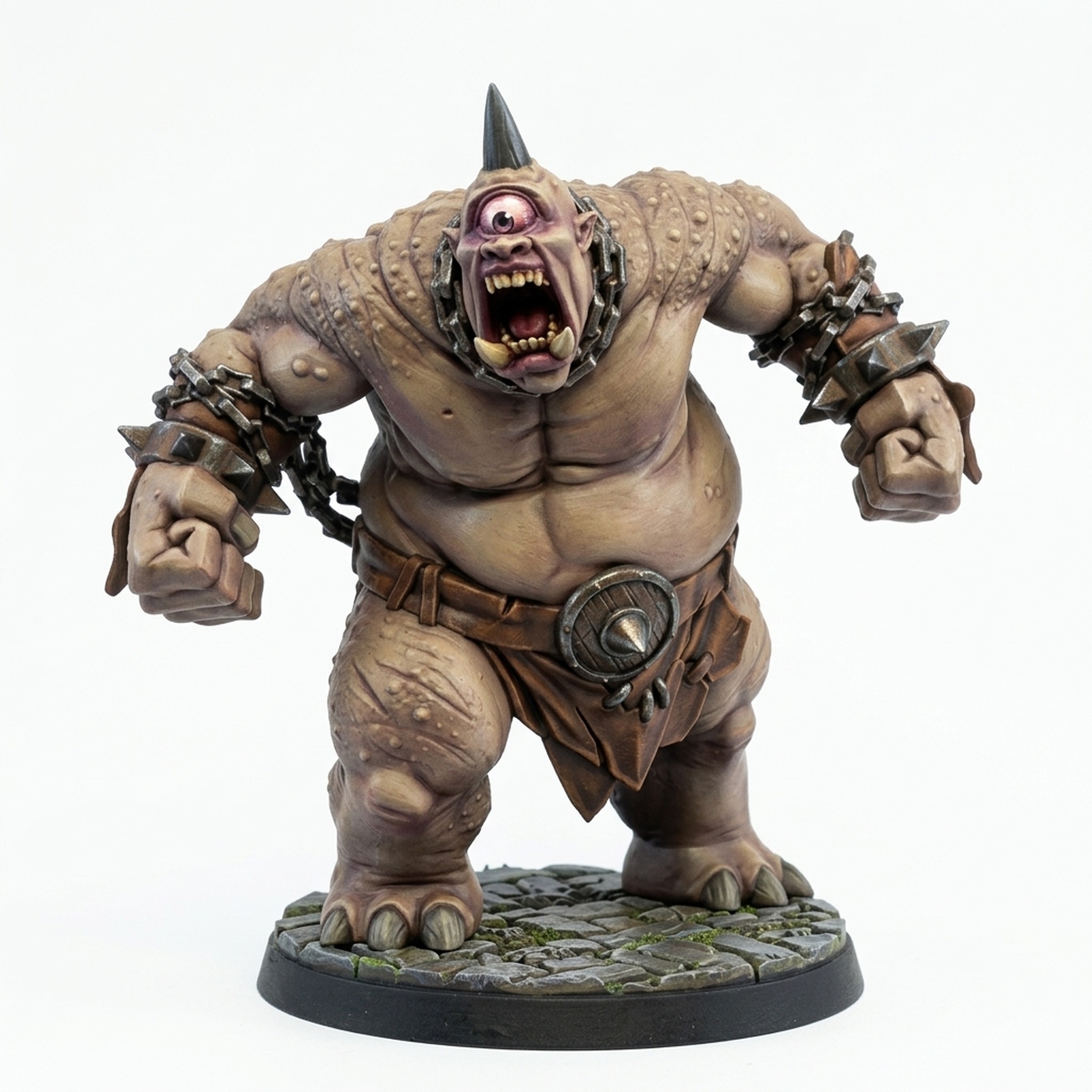 Perfect for Dungeon Masters looking for a memorable boss monster or a powerful enforcer, this cyclops brings unmatched presence to the battlefield. For miniature painters, the varied textures of tough skin, metallic chains, and leather-like armor offer a rewarding challenge to showcase advanced painting techniques and weathering effects. The sculpt's dramatic pose and high level of detail ensure that whether on the gaming table or in a display cabinet, this cyclops commands attention. He's not just a monster; he's a statement piece, ready to bash his way through any obstacles. Add this brutal behemoth to your forces and watch the chaos unfold.