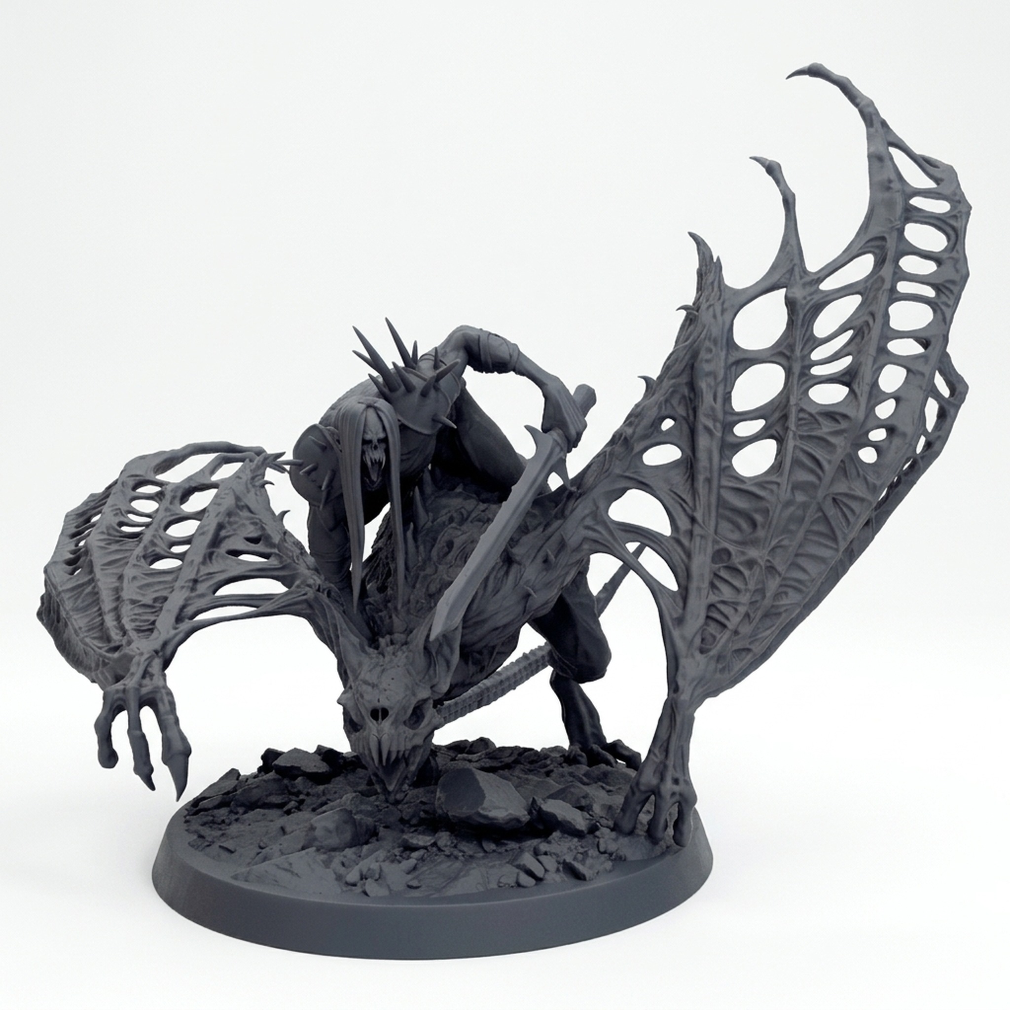 Introduce a terrifying aerial menace to your tabletop battles with the Dabeath Check Mount, a breathtakingly detailed miniature designed by Rescale Miniatures as part of their epic Broken Blood collection. This imposing figure features a menacing, bipedal monstrosity with massive, tattered wings and a rider perched upon its back, ready to launch a devastating attack. The intricate sculpt captures the raw power and otherworldly nature of this creature, from its skull-like face and powerful limbs to the complex texture of its leathery wings.