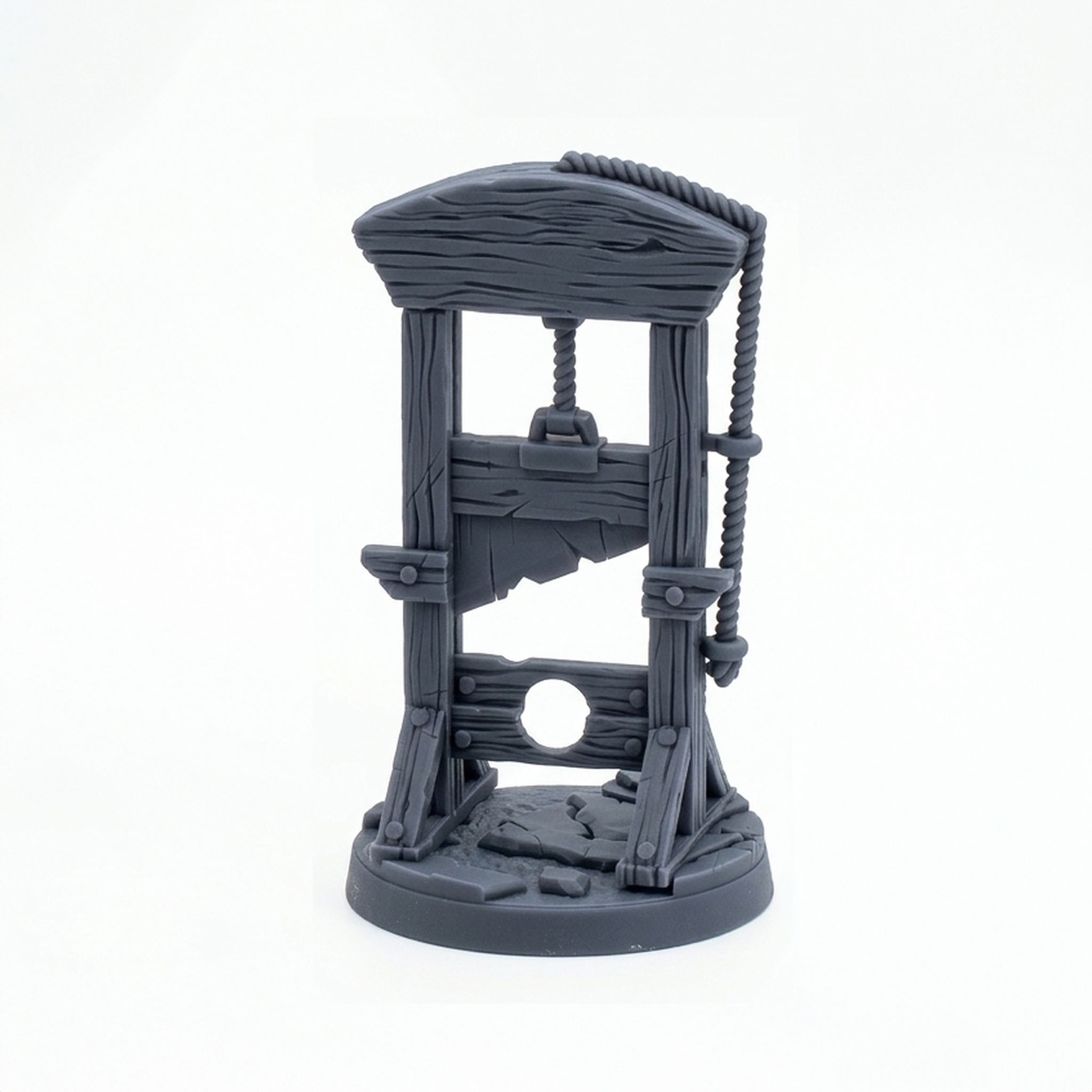 A gruesome and unexpected twist on a classic dungeon feature, this Guillotine miniature from CastnPlay's 'Mimics Mayhem' collection is ready to ambush your unsuspecting adventurers. The highly-detailed sculpt captures the object, with wooden textures, ropes, and a brutal blade, perfectly disguising the monstrous form waiting to spring into action. This dual-purpose miniature includes both the disguised guillotine and the grotesque, open-mouthed mimic form, complete with multiple eyes, sharp teeth, and reaching tentacles.