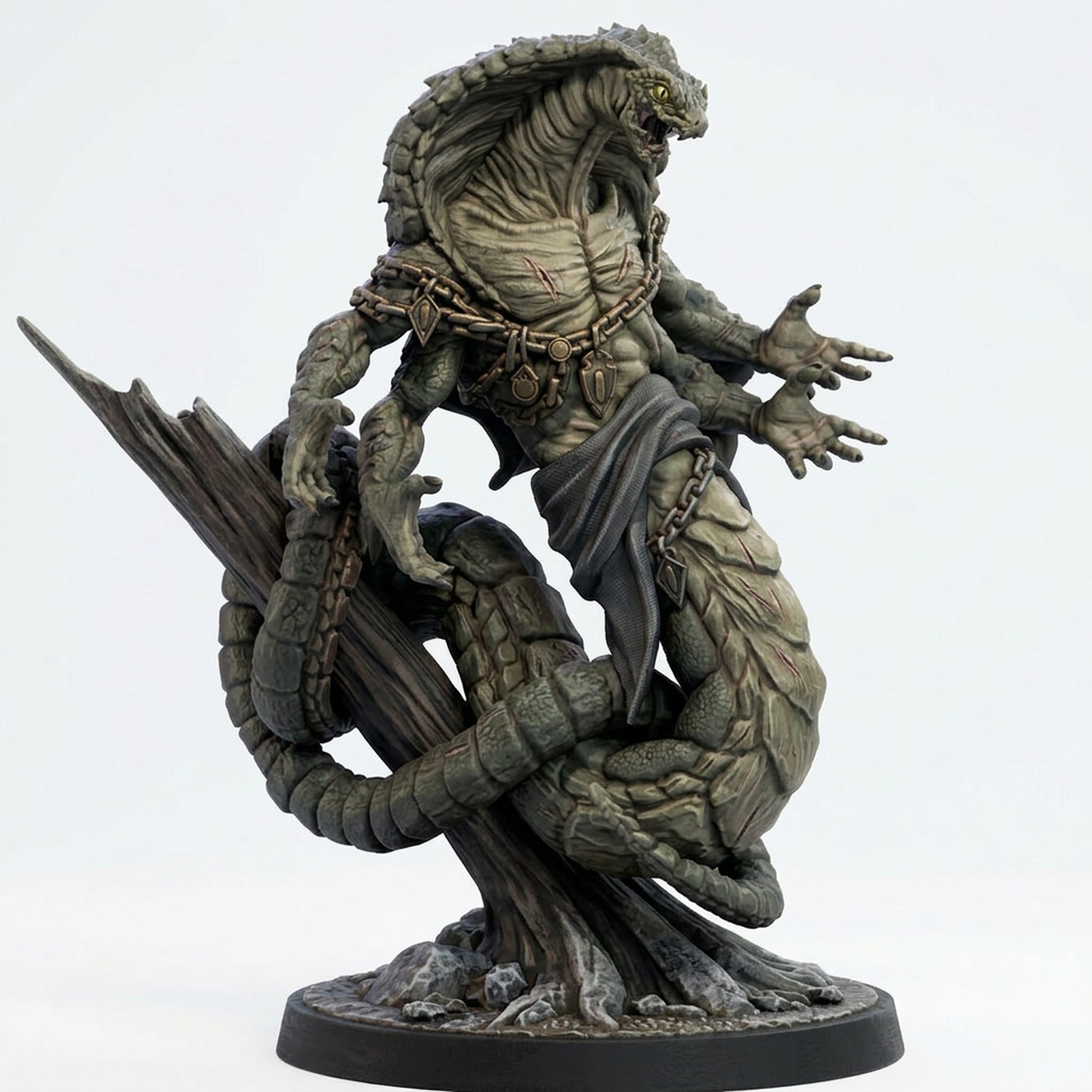 Introduce a terrifying new antagonist to your campaign with the Ssrall Broodlord from the acclaimed ‘Coils of Dread’ collection by Mammoth Factory. This stunning miniature depicts a towering four-armed serpentfolk leader, coiled and ready to strike with menacing power. Every inch of this sculpt is packed with exquisite detail, from the intricate scale patterns and muscular physique to the elaborate ceremonial jewelry and the weathered, broken obelisk integrated into its base.