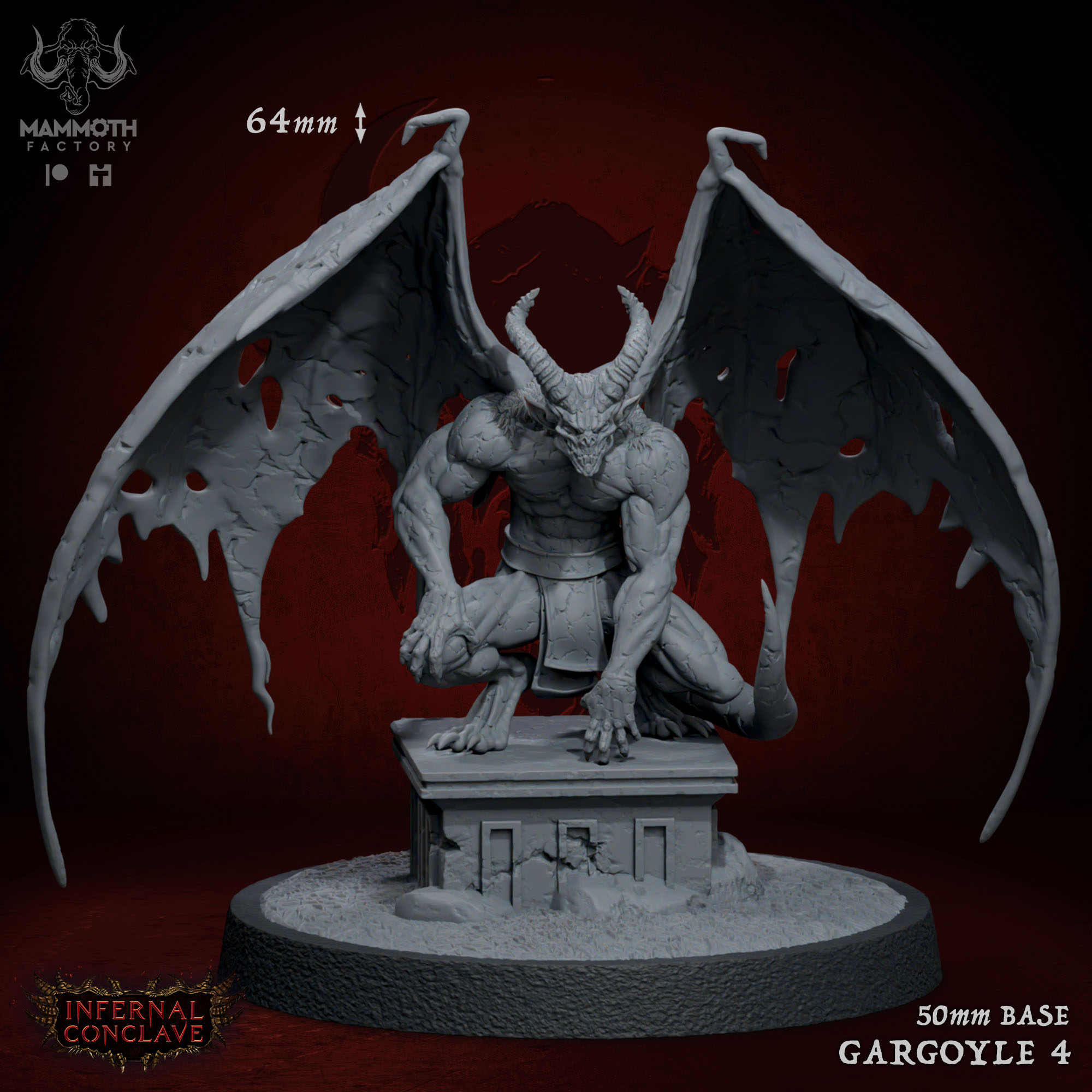 Introduce a powerful new guardian or dynamic villain to your tabletop adventures with the Stonecursed Gargoyle 4. Part of Mammoth Factory’s imposing Infernal Conclave collection, this miniature showcases exceptional sculpting quality. The gargoyle is captured in a crouched, vigilant pose atop a ruined stone plinth, ready to spring into action. Its muscular, rock-like hide is covered in intricate cracks and stony textures, perfect for highlighting with drybrushing and washes, while its large, ragged bat-like wings create a menacing silhouette that demands attention on any battlemap.