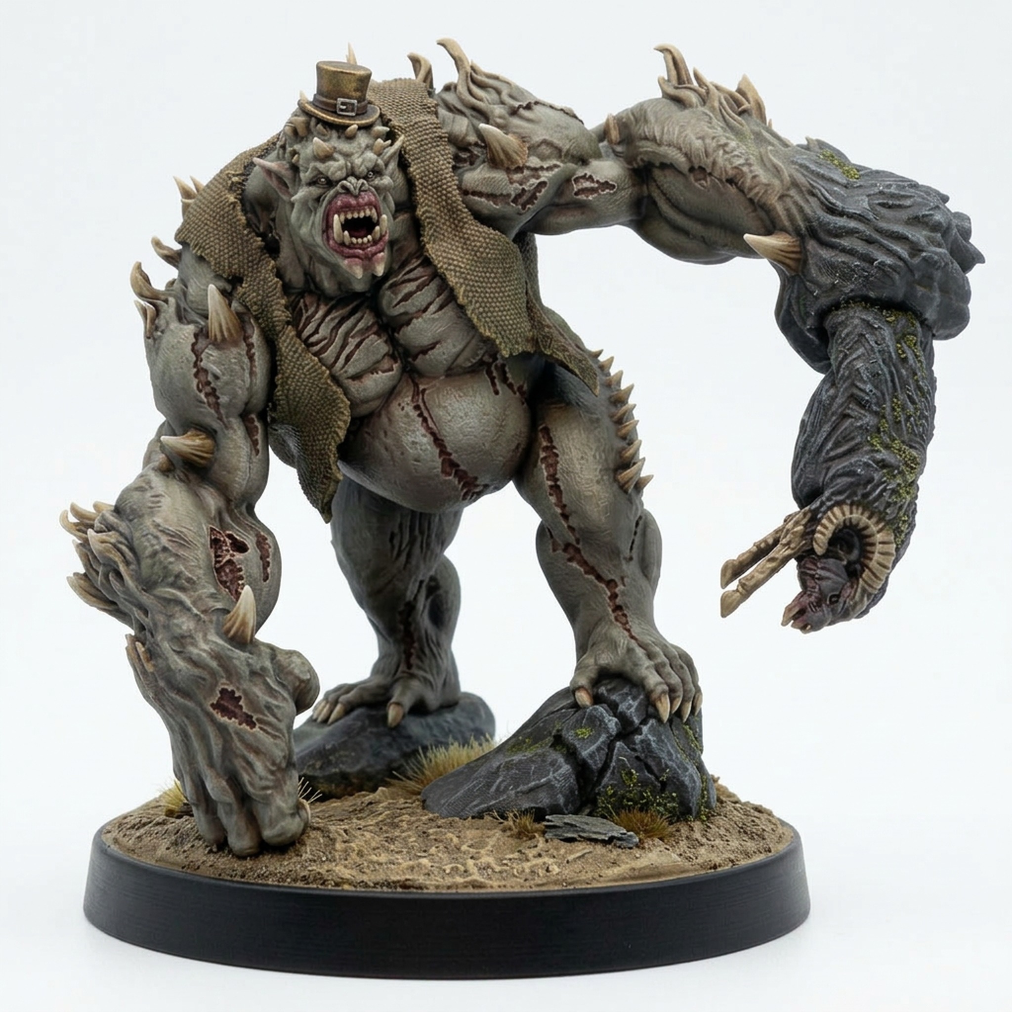 Unleash chaos on your tabletop with The Fez Beast, a truly grotesque monstrosity from Mammoth Factory’s “Cave Of Blunders” collection. This hulking creature, named for the disproportionately small fez perched ludicrously atop its horned head, is a masterclass in unsettling design. Sculpted with a massive, asymmetrical build, its muscular, scarred body is draped in a textured vest, contrasting bizarrely with its raw, bestial power. The pose captures it mid-lunge, balanced on uneven ground with one colossal arm resting heavily, while the other—ending in an eerie, fused hand featuring a goat skull—reaches out menacingly. The gaping maw filled with jagged teeth and the intense, furious expression ensure this model will dominate any battlefield or display shelf. The incredible textures from the tattered cloth to the cracked skin make it a dream for miniature painters seeking a challenging and rewarding project. Whether as a unique boss monster in Dungeons & Dragons, a terrifying guardian in Pathfinder, or a centerpiece in a chaos army, this miniature is bound to leave a lasting impression. This model is 3D printed in high-quality resin, ensuring crisp, durable details.