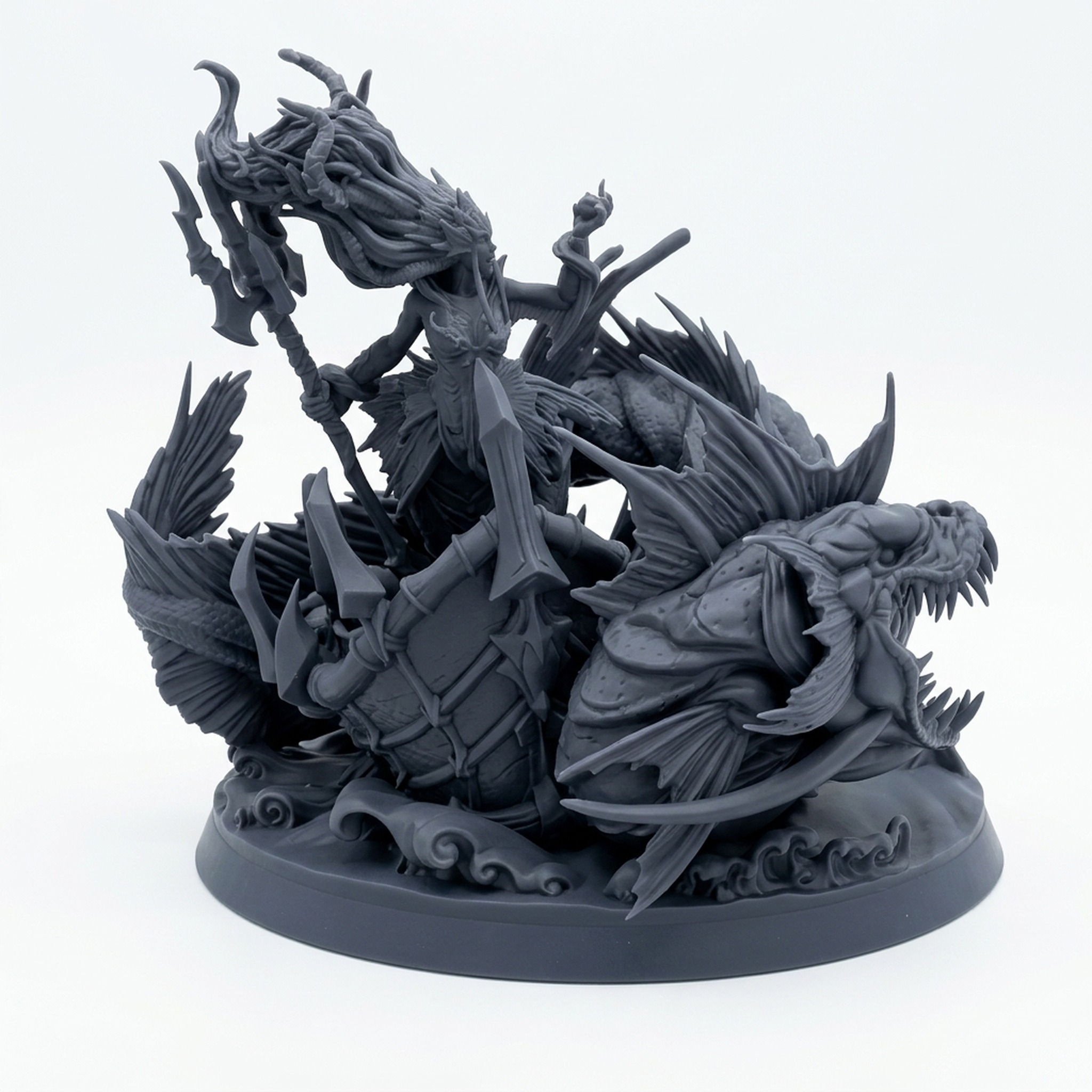 Perfect for Dungeon Masters looking for a formidable boss for an underwater campaign or for miniature painters seeking a complex and rewarding project. This two-part miniature (queen and mount) offers multiple options for display and gameplay. Bring a wave of terror to your next tabletop session with this masterful creation.