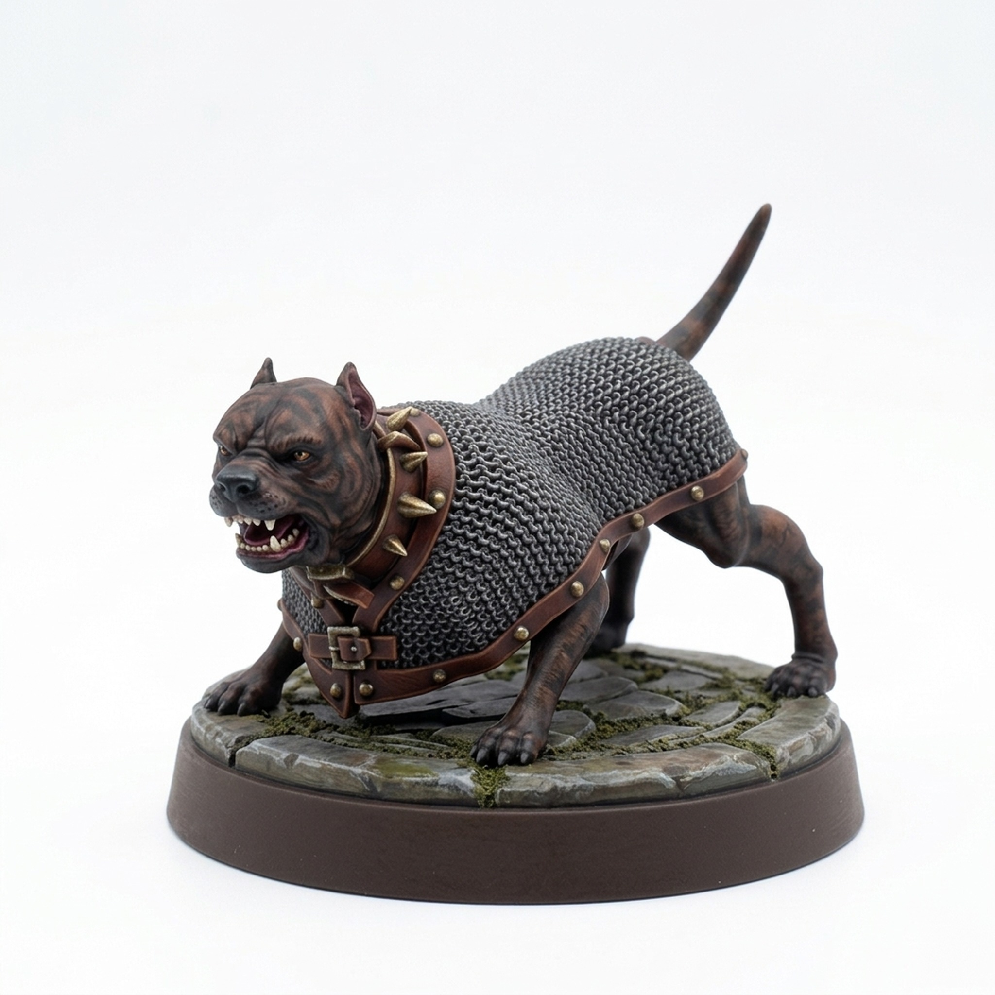 Painters will appreciate the contrast between the organic texture of the dog's fur and the metallic patterns of the armor plating and mail. The snarling expression is finely detailed, showcasing the high-quality craftsmanship of the sculpt. This miniature is ideal for bringing encounters with trained beasts to life on your battle map.