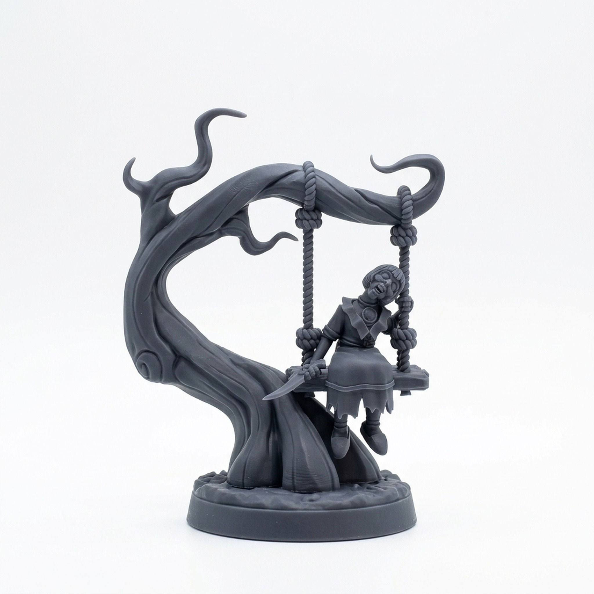 Bring nightmares to life on your tabletop with Twisted Tommy, a hauntingly detailed creep puppet miniature from the talented designers at CastnPlay. Seated upon a gnarled, twisted tree branch swing, this menacing figure leans forward with a wide, disturbing grin and a visible knife clasped in its hand. The sculpt perfectly captures a sinister, possessed toy aesthetic, blending innocent forms with malevolent intent. It's a fantastic centerpiece for horror campaigns, haunted house encounters, or a unique villain for your next DnD session.
