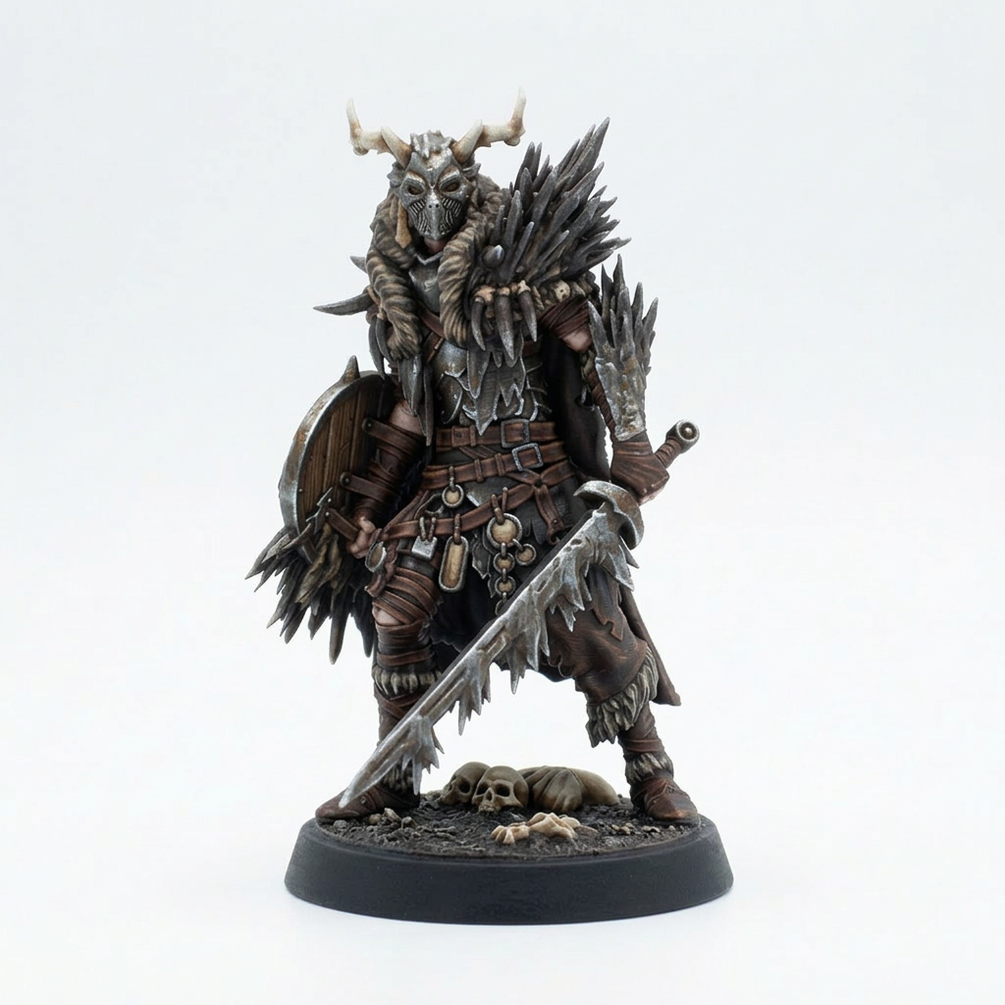 Bring an icy chill to your tabletop campaigns with the Arisen Ancestor 1 miniature from Mammoth Factory's acclaimed Frostwilds 2 collection. This incredibly detailed sculpt features an undead warrior clad in frozen, spiky armor, brandishing an icicle-like blade and a shield. The intricate details of the fur trim, bone trophies, and textured ice make this a stunning piece for any fantasy setting.