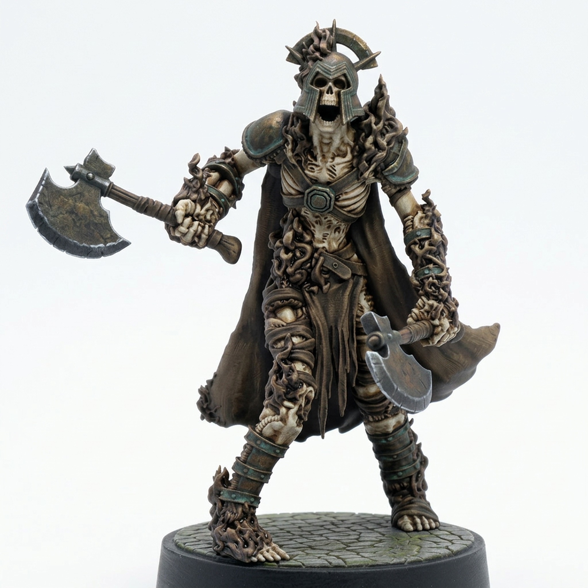 Unleash the horrors of the grave with the Death Bound Thrall 5 Fire miniature. This terrifying undead warrior, part of The Burning Dead collection from Mammoth Factory, stands ready to serve a dark master. Sculpted with incredible attention to detail, this skeletal warrior is wrapped in burning fire and tattered armor, wielding dual battleaxes in a dynamic, menacing pose. Every rib bone, crack in the skull, and flicker of flame is captured in stunning clarity, making this a standout piece for any miniature collection or tabletop encounter.