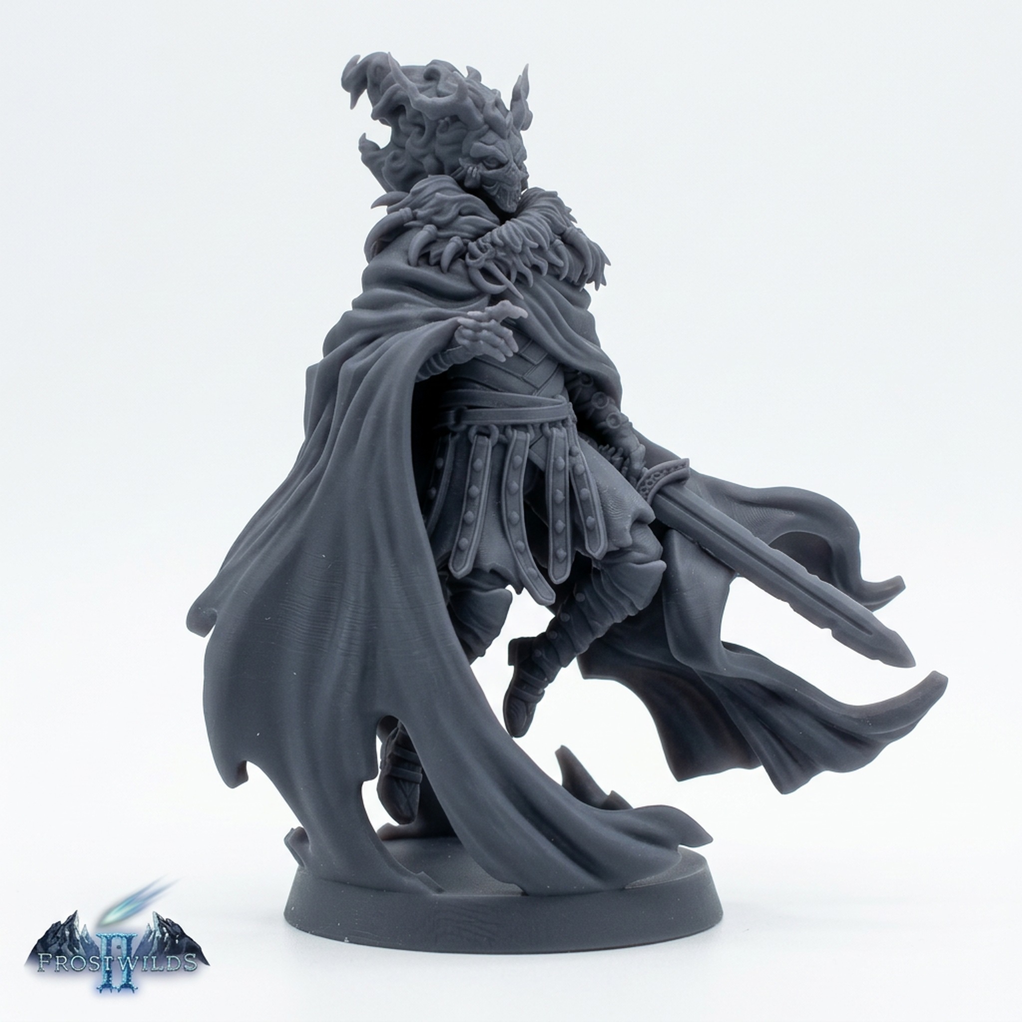 Whether you envision this character as a vengeful spirit, a unique elemental, or a champion of an ancient frost giant, the Warrior of Winters Past is sure to impress. Painters will appreciate the sharp details, especially the texture of the 'ice' armor and the intricate flow of the drapery, allowing for advanced techniques and stunning final results. Its imposing presence makes it a fantastic boss, elite adversary, or unique player character. This miniature is 3D printed in high-quality resin, ensuring crisp details and a durable finish for your gaming needs.