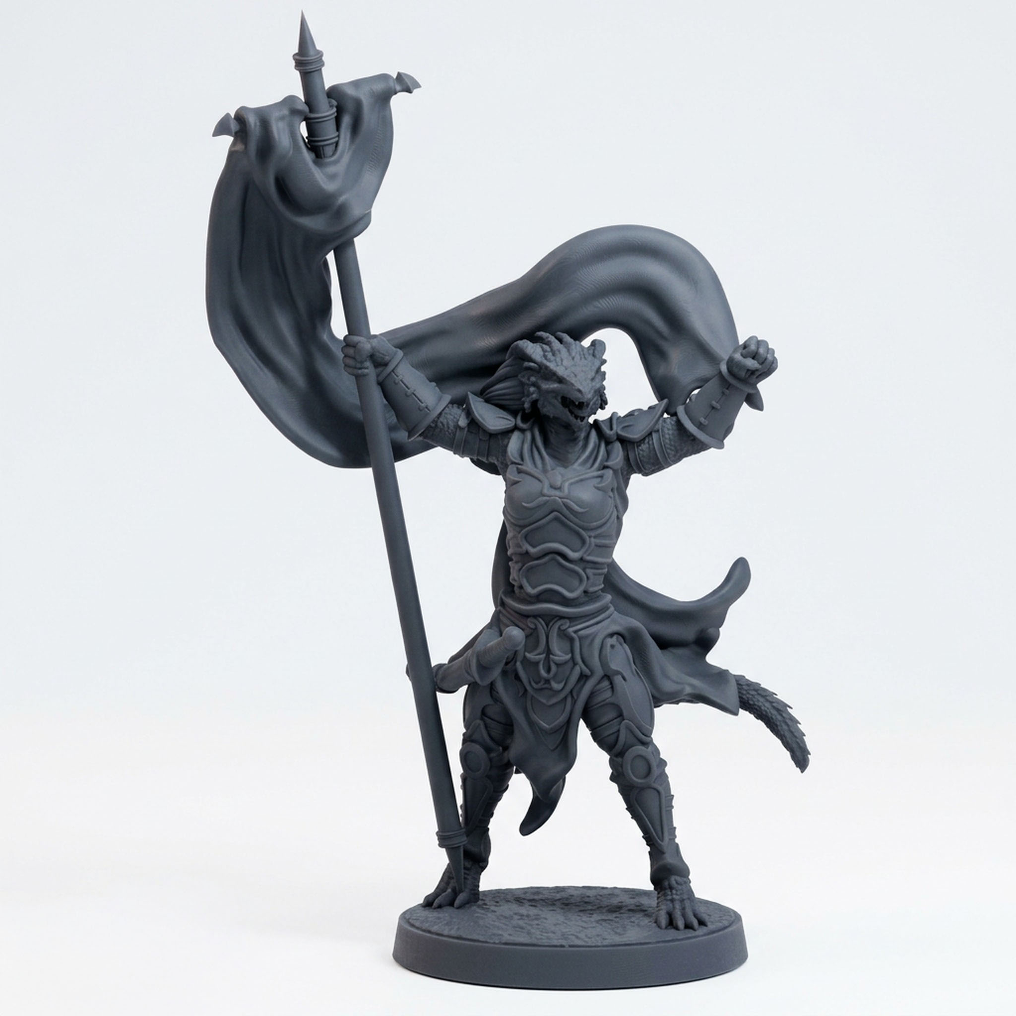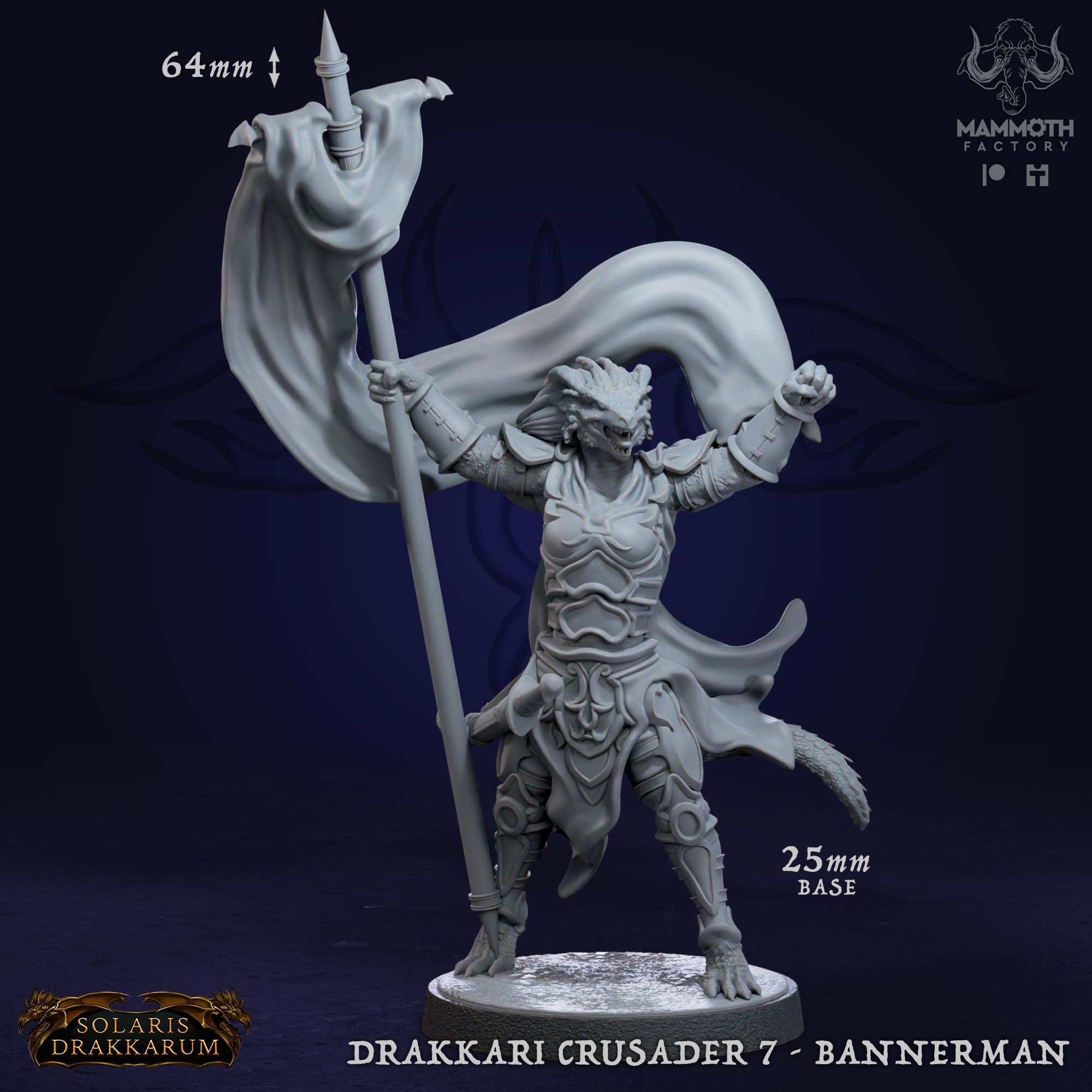 Lead your forces to victory with the Drakkari Crusader 7 Bannerwoman from Mammoth Factory’s Solaris Drakarum collection. This stunningly detailed dragonborn miniature captures the role of a steadfast standard bearer, holding high the army’s banner to inspire her comrades and demoralize her enemies. The dynamic flow of the banner itself is a masterpiece of digital sculpting, adding a sense of movement and authority to any tabletop battle.