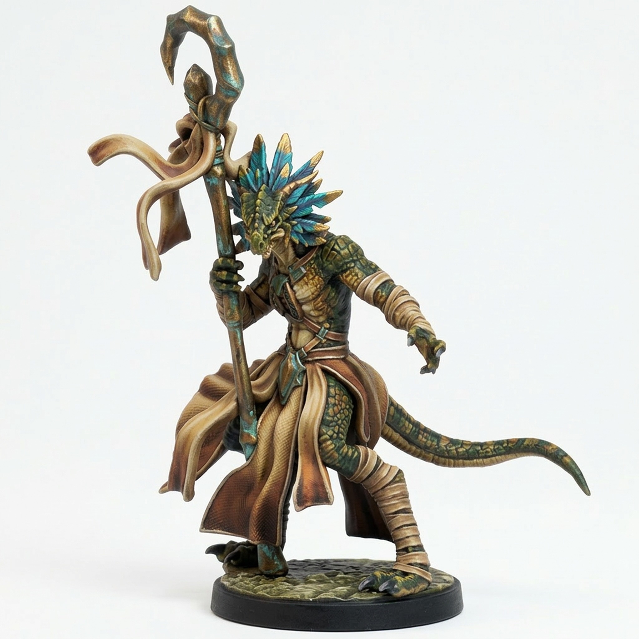 Unleash primitive arcane power on your tabletop with Maraak Drakkling Sparkcaster. This dynamic miniature, from the ‘Drakklings of Dragon’s Keep’ collection by Mammoth Factory, depicts a formidable reptilian spellcaster caught in the act of channeling primal energy. Clad in layered robes with bandaged limbs and a striking skull-like feathered headdress, Maraak wields a gnarly, cloth-wrapped staff, ready to unleash devastating spells. The intricate details, from the texture of the scales and tail to the flow of the fabrics, capture a character both feral and mystically potent, perfect for representing a unique Dragonborn sorcerer, warlock, or shaman in your TTRPG campaign.