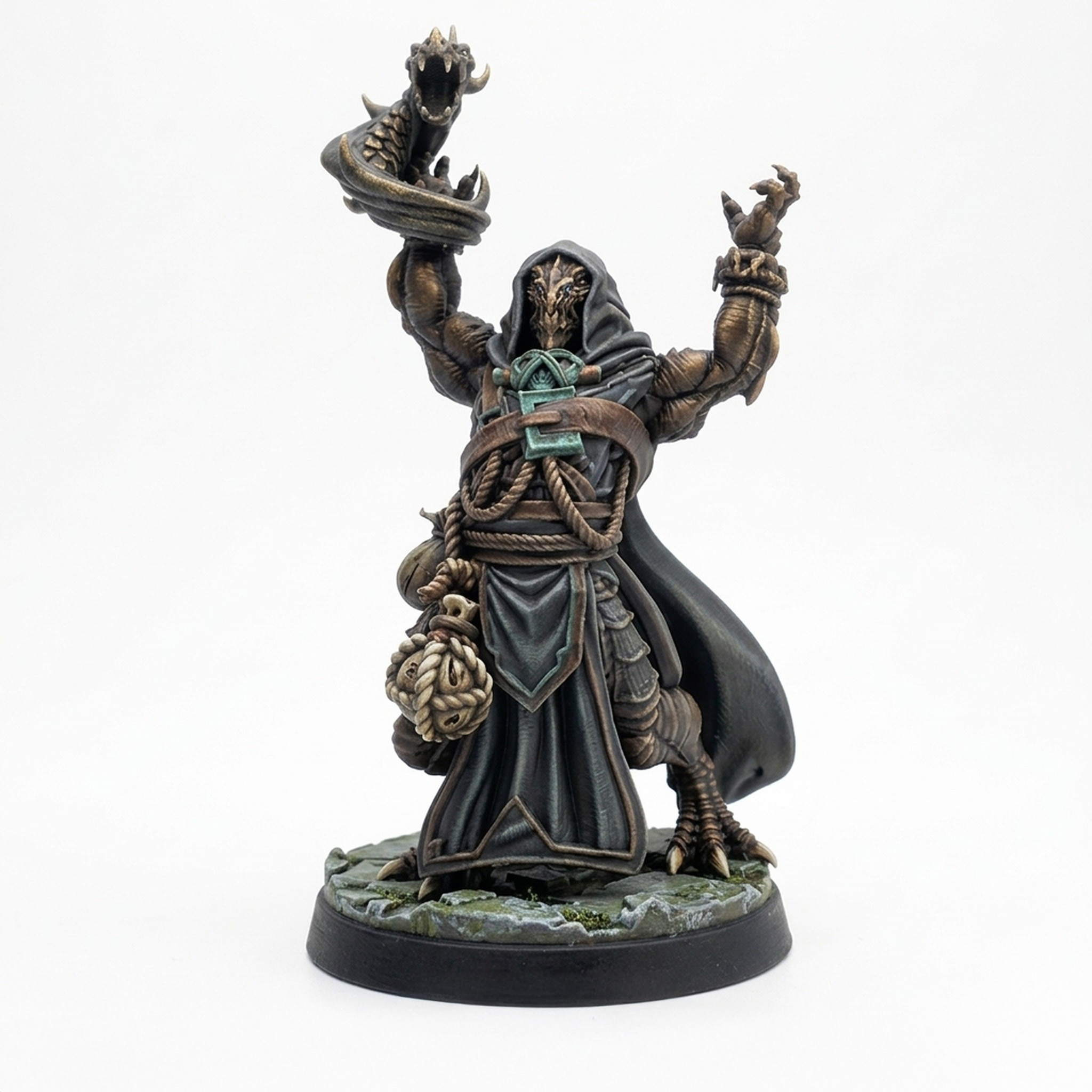 Relickeeper D from CastnPlay's epic Dragon Seekers collection is a masterpiece of dark fantasy design. This highly detailed miniature depicts a reptilian humanoid, possibly a Dragonborn or similar creature, clad in intricate robes, heavy capes, and decorative sashes. Positioned defensively on an ornate circular base, the Relickeeper stands as a formidable guardian of forgotten knowledge or powerful artifacts. Whether you envision this character as a devout Cleric guarding a temple's treasures or a reclusive Sorcerer wielding ancient power, this sculpt captures both mystery and might.