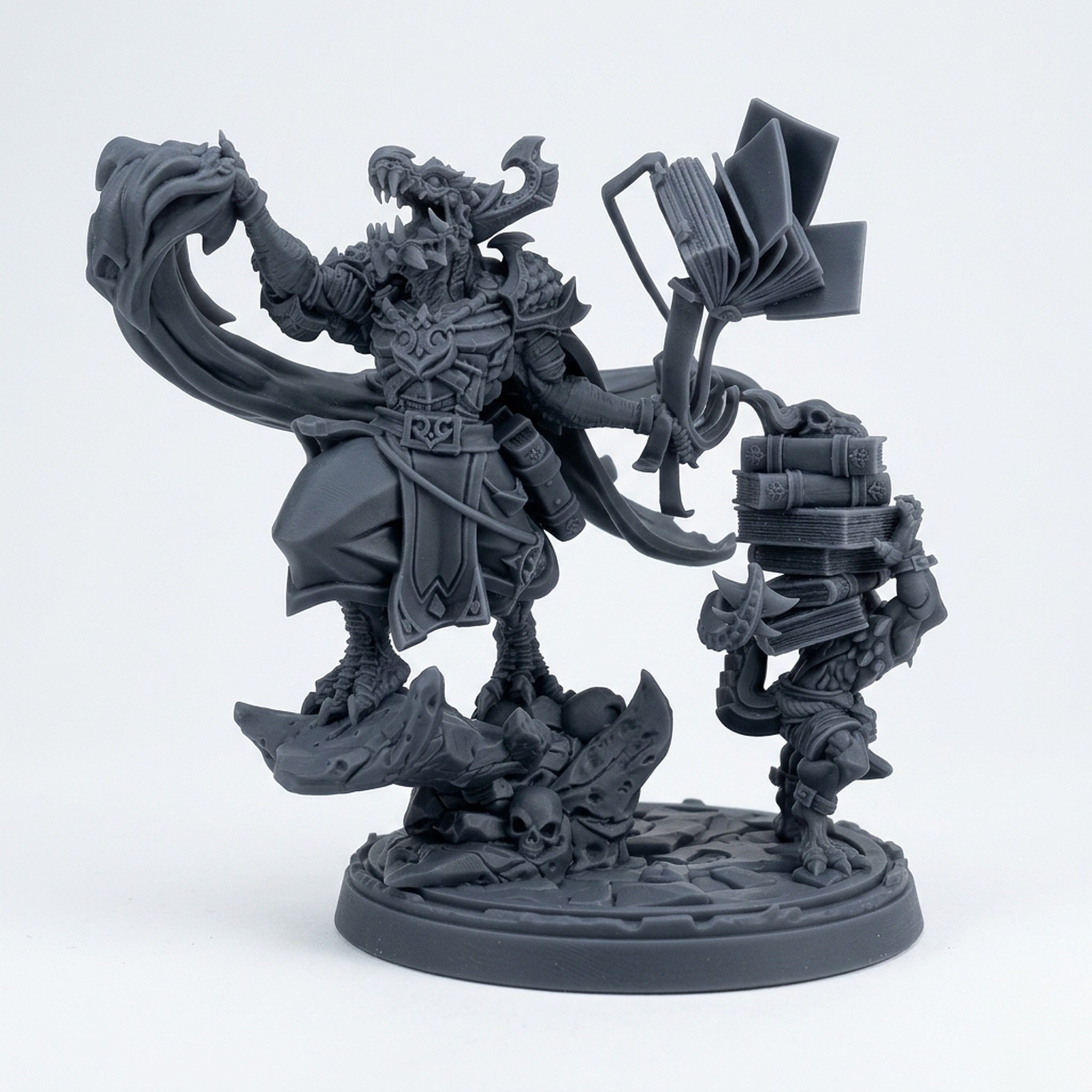 Expertly sculpted by CastnPlay, this miniature boasts incredible detail, from the scale patterns on his hide to the flow of his robes and the intricate magical effect. He comes complete with a custom scenic base and his dutiful lore-keeper assistant, making him a true centerpiece for your collection. Enhance your games and bring this mighty Draconian hero to life with our high-definition 3D printed resin, ensuring sharp details and durability for a model that truly stands out on the table.