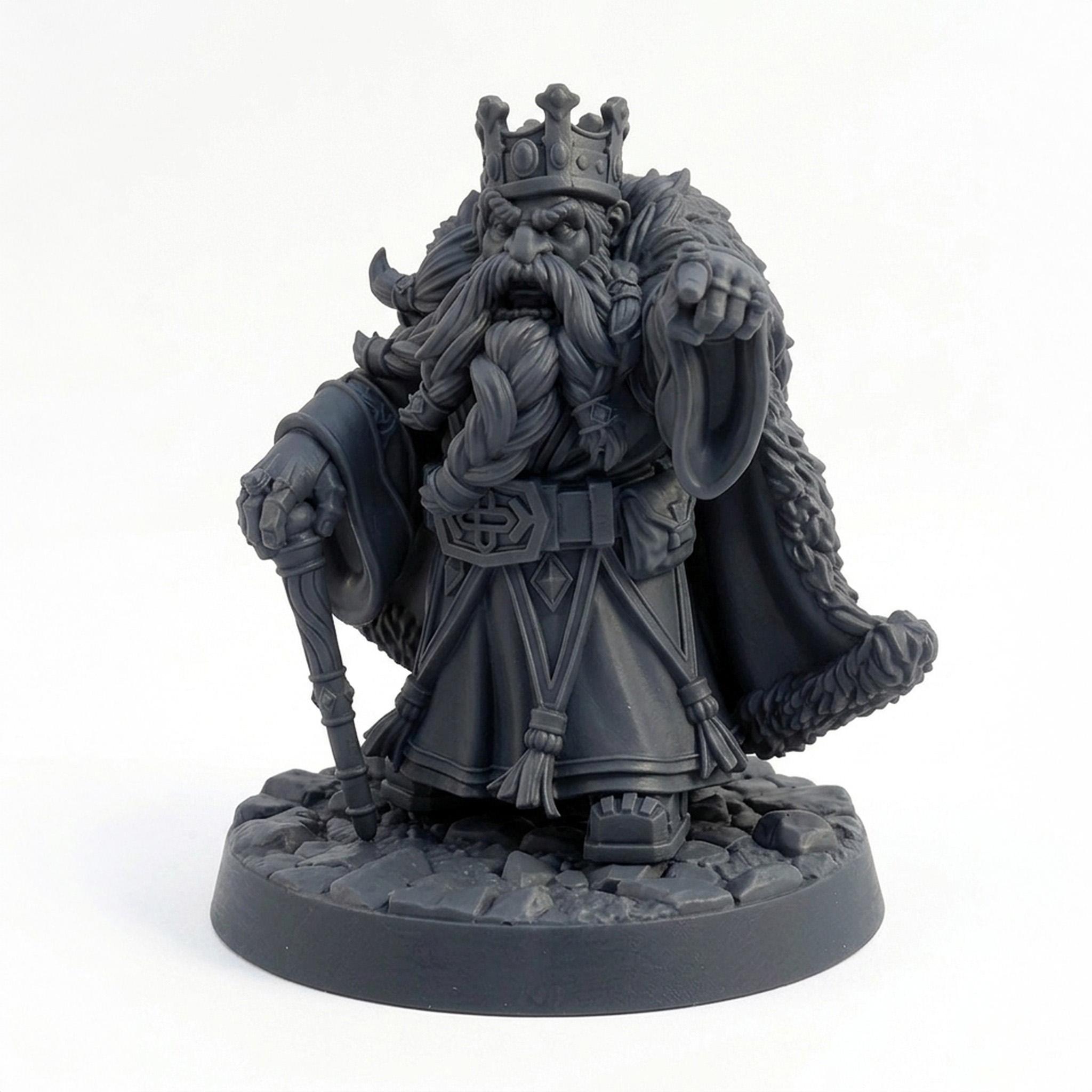 Lead your mountain hold to glory with this magnificent **Dwarven King Durnar Goldheart** miniature from the acclaimed **Dwarven Legacy** collection by designer **CastnPlay**. This incredibly detailed sculpt captures the essence of a powerful and wise dwarven monarch, featuring intricate braided beard details, heavy ceremonial robes with textured fur trim, and a regal crown. Whether commanding from the front lines or holding court on a terrain piece, this king is sure to be a centerpiece of your tabletop battles or RPG campaign. Designed for 32mm scale tabletop gaming, this model offers a rewarding challenge for miniature painters. The deep textures and crisp details, from the gems in his crown to the folds in his heavy cloak, provide ample opportunity for advanced painting techniques like highlighting, wash application, and non-metallic metal effects. Bring this noble character to life and establish a formidable presence on your gaming table, perfect for Dungeons & Dragons, Pathfinder, or any fantasy wargame. This miniature is 3D printed in high-quality resin, ensuring durable, sharply defined figures with minimal layer lines. It comes supplied clean and supports removed, ready for assembly (if needed) and painting to integrate seamlessly into your growing collection.