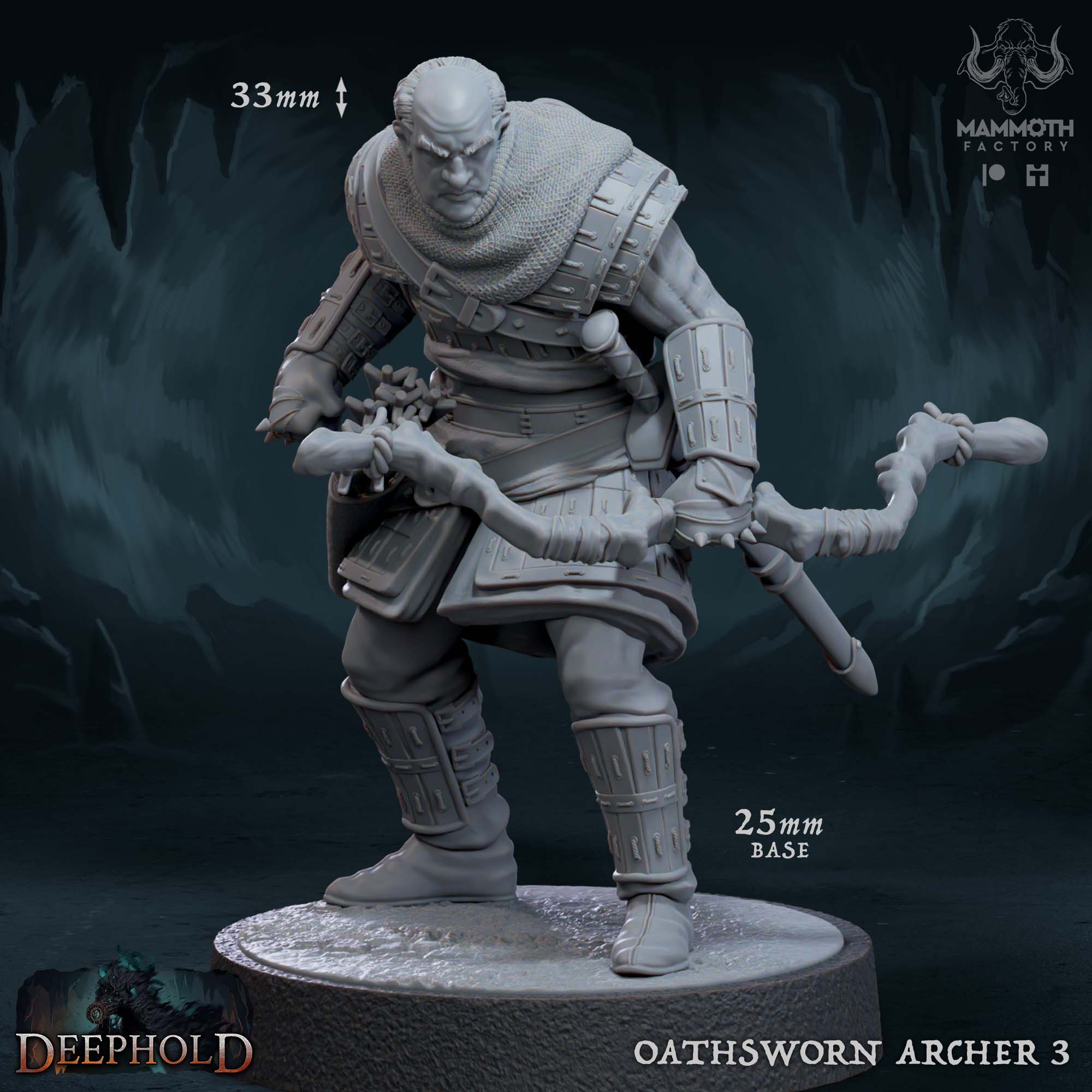 Bring your tabletop battles to life with the formidable Oathsworn Archer 3 from Mammoth Factory’s DeepHold collection. This highly detailed miniature captures a rugged warrior, chainmail cowl pulled tight, ready to loose an arrow from their weathered bow. The intricate sculpt shows every detail of their armor and gear, making it a perfect addition to any ranger, fighter, or mercenary unit in your DnD, Pathfinder, or other fantasy wargames. Add this steadfast defender to your party and let their aim be true.
