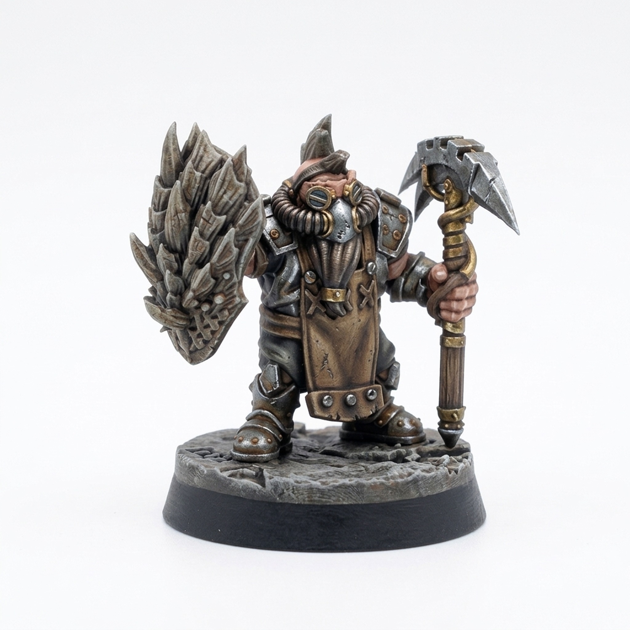 Bring ingenuity to your tabletop games with the Spark Gadgeteer E miniature from the Vulcan Dwarves collection by CastnPlay. This expertly sculpted figure captures a heavily-armored dwarf engineer, complete with an elaborate bladed shield and a pickaxe, ready to defend their inventions or secure resources in the heat of battle. The intricate details, from the ventilation tubes on the armor to the unique design of the shield and mask, provide a fantastic canvas for miniature painters looking to showcase their skills.