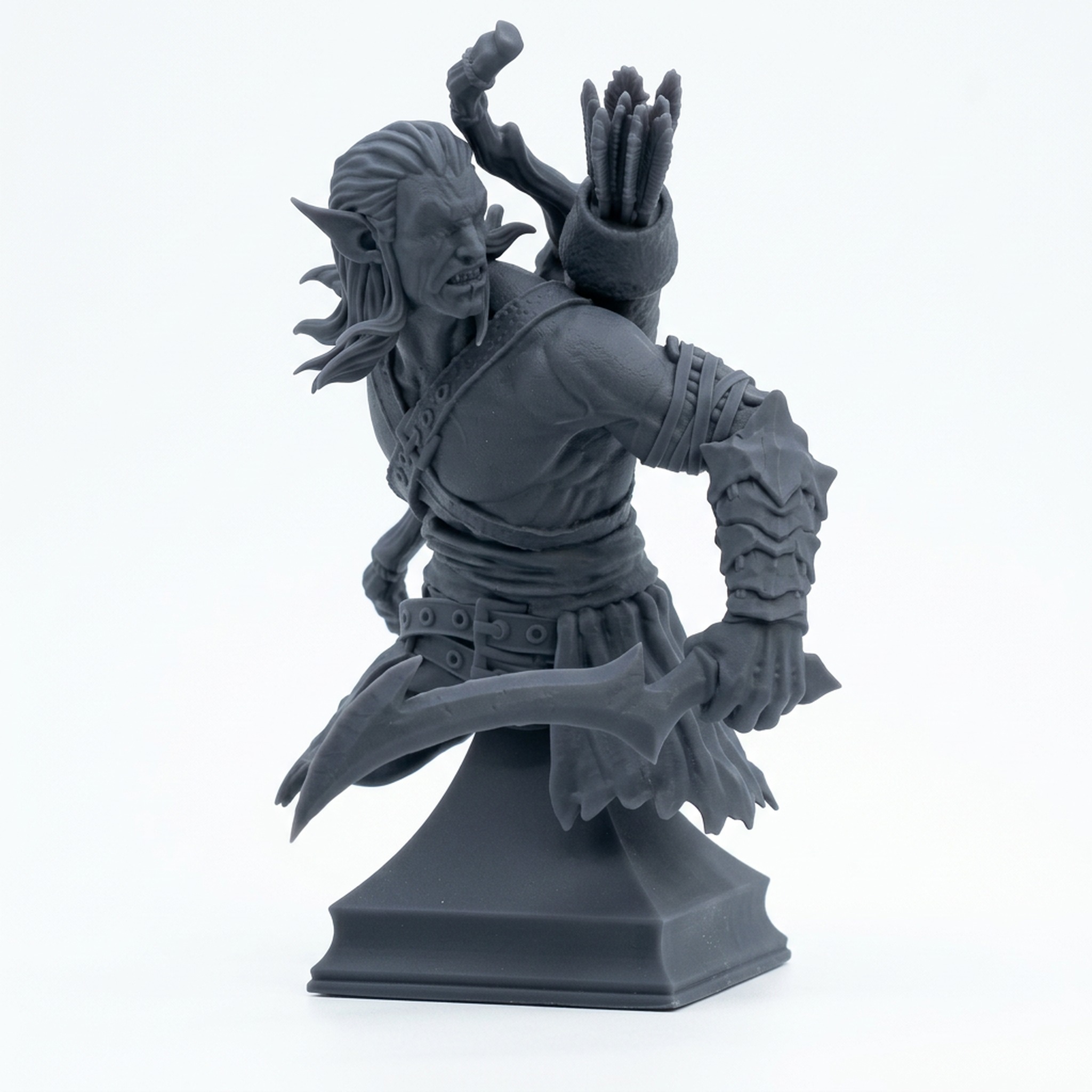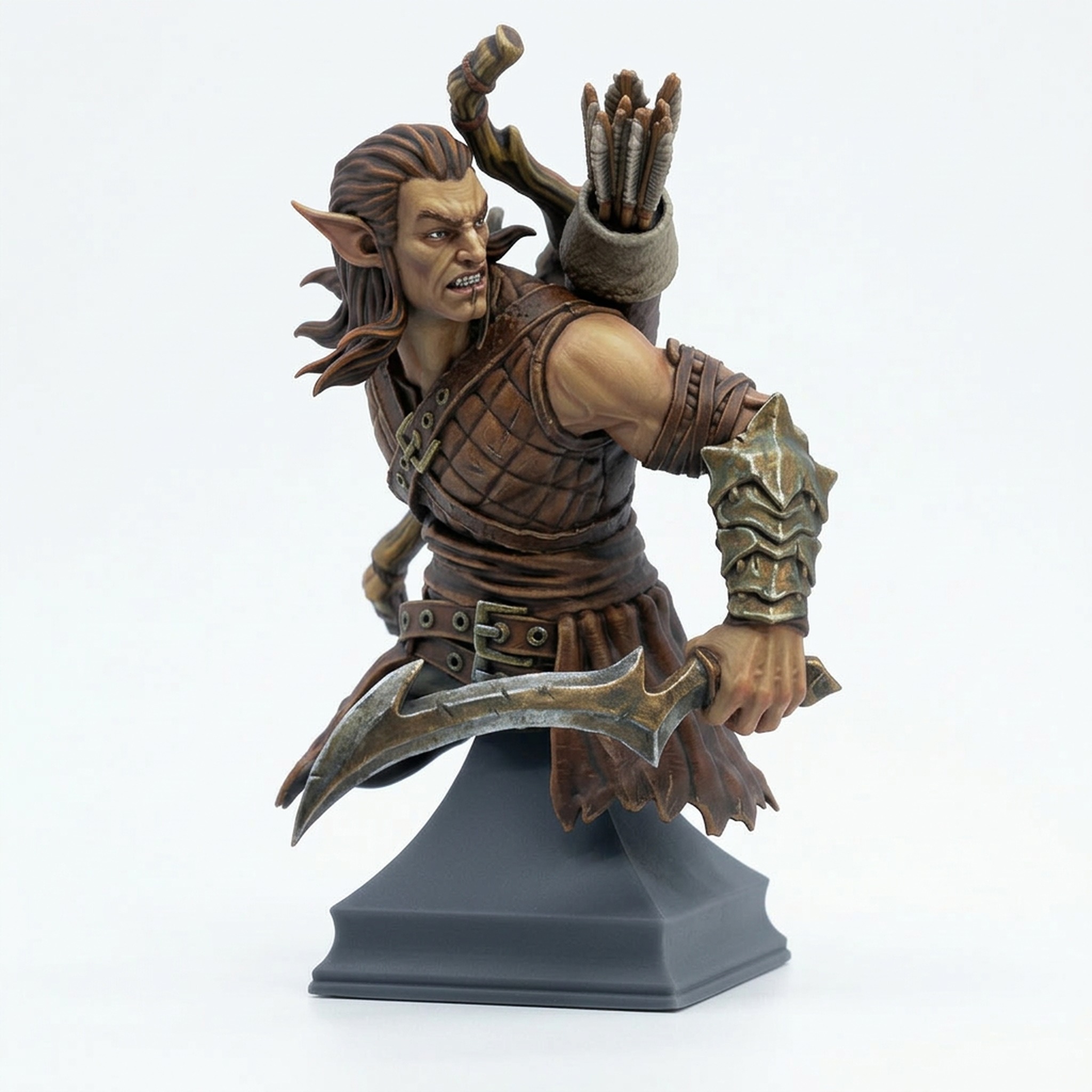 As a display piece, this bust allows for intricate brushwork, letting you highlight the musculature and the intricate details of his gear, including the quiver full of arrows and the uniquely crafted dagger he grips. Whether used as a magnificent painter’s canvas or as a formidable presence in your RPG campaign’s central hub, the Woldling Warrior bust commands attention. He represents the untamed spirit of the wild, making him an excellent addition to any collection.