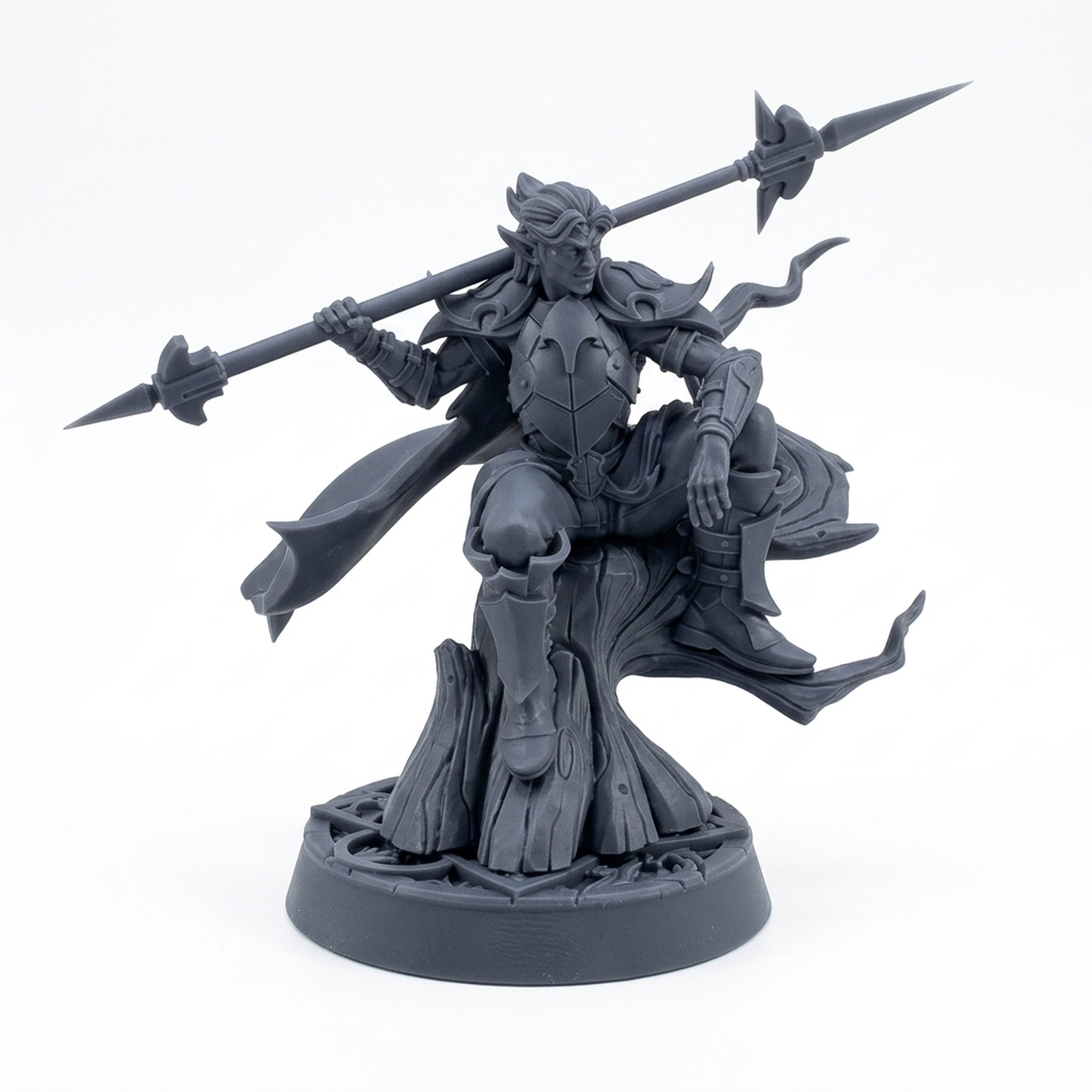 Protect the ancient forests with the Elf Protector Fandoor Elyar miniature from the acclaimed Elvenwood Grove collection by CastnPlay. This highly detailed sculpt captures the grace and power of an elven warrior, posed dynamically with a spear and ornate armor that showcases fine filigree. It's a perfect central character for your tabletop RPG campaigns, representing a dedicated defender of nature or a skilled fighter in your fantasy armies. This level of intricate detail is ideal for miniature painters looking to showcase their skills, bringing the character's personality to life with vibrant colors and techniques. Whether you need a specific NPC to guide your party, a new player character, or a unique champion for your wargaming unit, Fandoor Elyar stands ready. The expressive face and flowing lines of the pose and cloak make this miniature truly special and sure to be a standout piece on any gaming mat. This miniature is 3D printed to a high standard using quality resin, ensuring sharp details and a durable finish for endless gaming sessions.