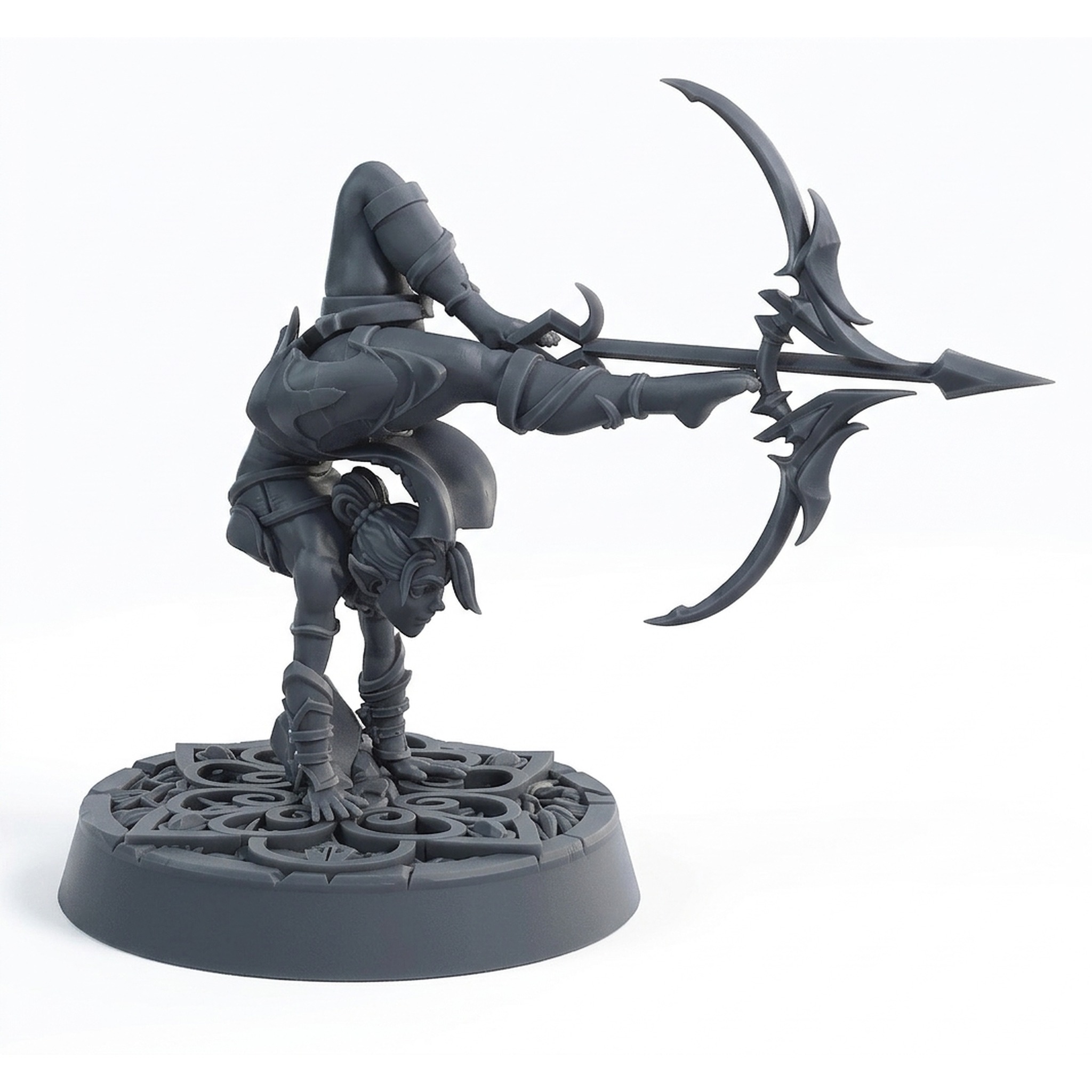 Bring a touch of lethal elegance to your tabletop adventures with the Elven Rogue Liah miniature. Masterfully sculpted by CastnPlay for the Elvenwood Grove collection, this resin miniature captures a truly unique and dynamic pose. Defying gravity in a stunning handstand, Liah is poised to unleash an arrow from her intricately designed bow. Her flowing hair and lithe form showcase the incredible attention to detail that miniature painters and players crave.