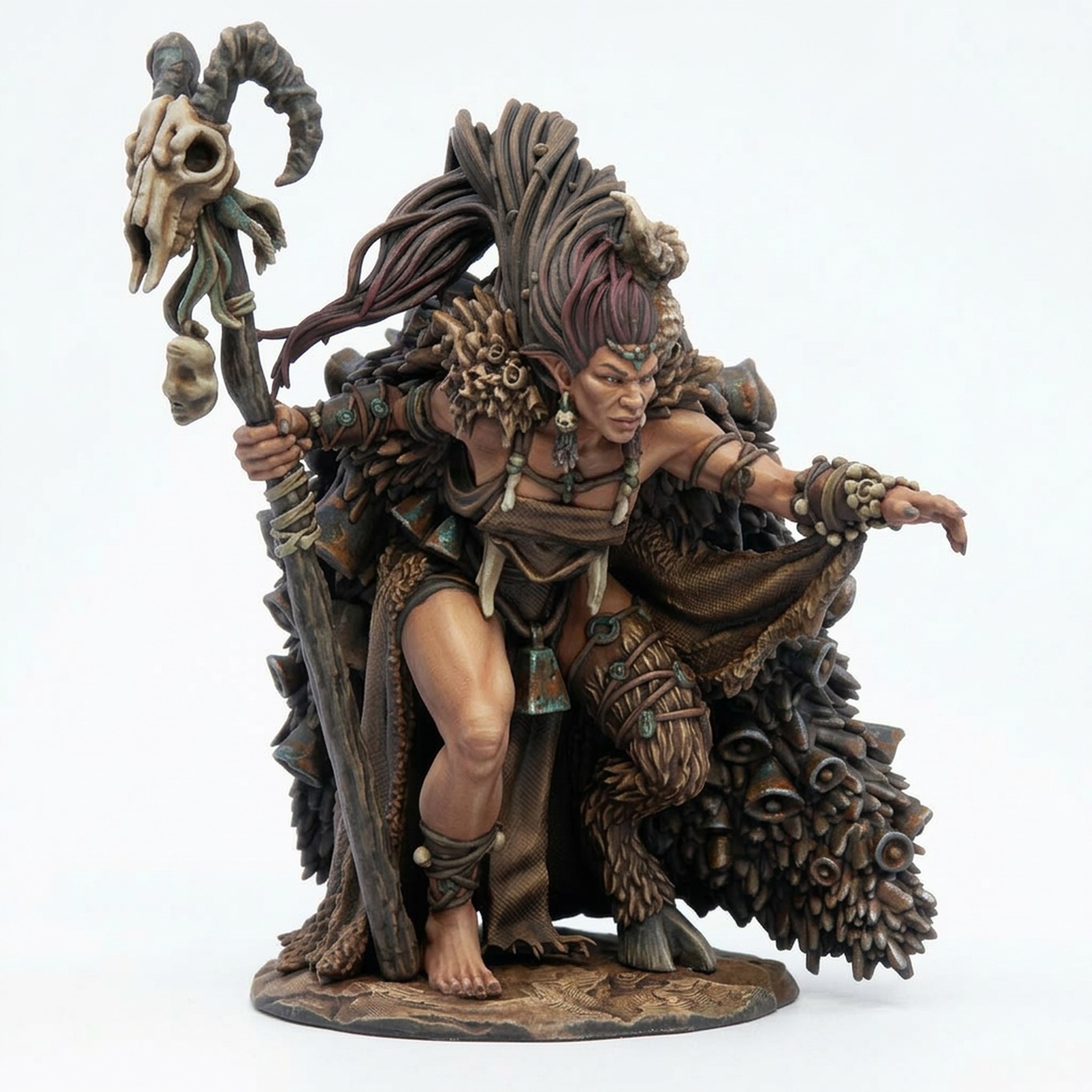 Whether commanding a horde of primal beasts or acting as a formidable adversary, this Savage Witch brings character and menace to your encounters. The exceptional quality of the sculpt ensures that every feather, bone, and strand of hair is rendered with clarity, providing a satisfying challenge for miniature painters and a captivating presence on the battlefield.