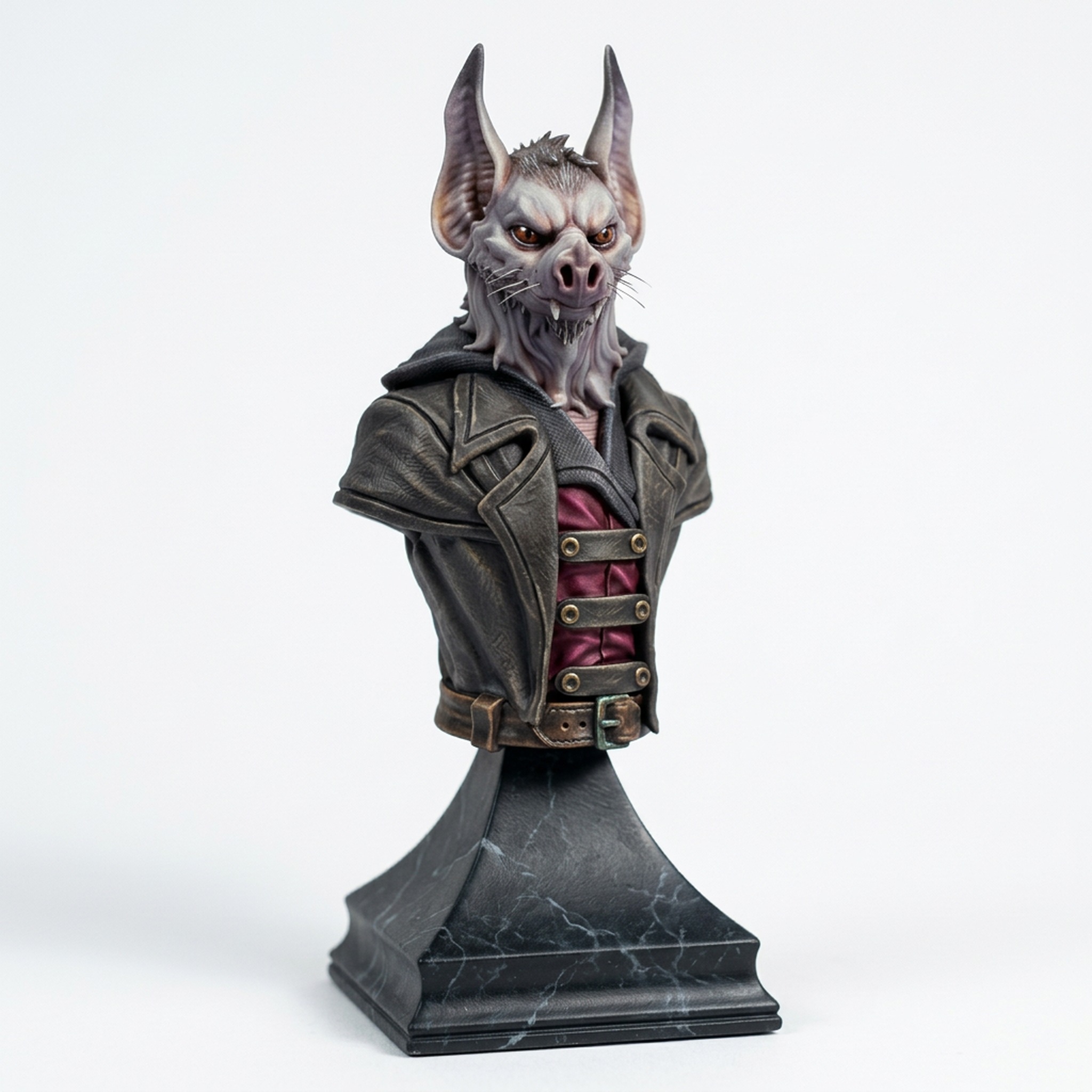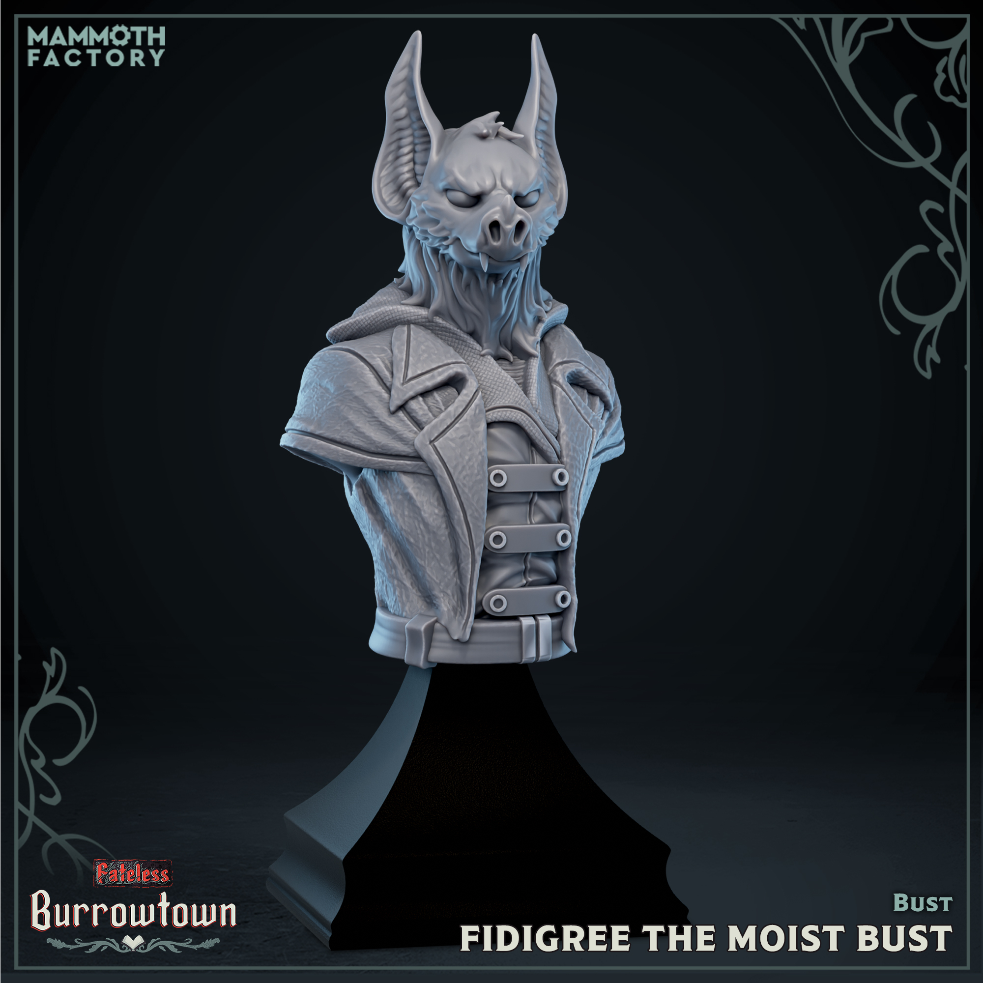Add a touch of the macabre and stylish to your collection with the BUST Fildigree The Moist from the Burrowtown collection. Designed by the talented artists at Mammoth Factory, this bust captures the character’s unique essence in striking detail. Fildigree, with his distinct bat-like features, pointed ears, and detailed leather-style jacket, is a fantastic piece for display, representing a compelling NPC or even a player character portrait.