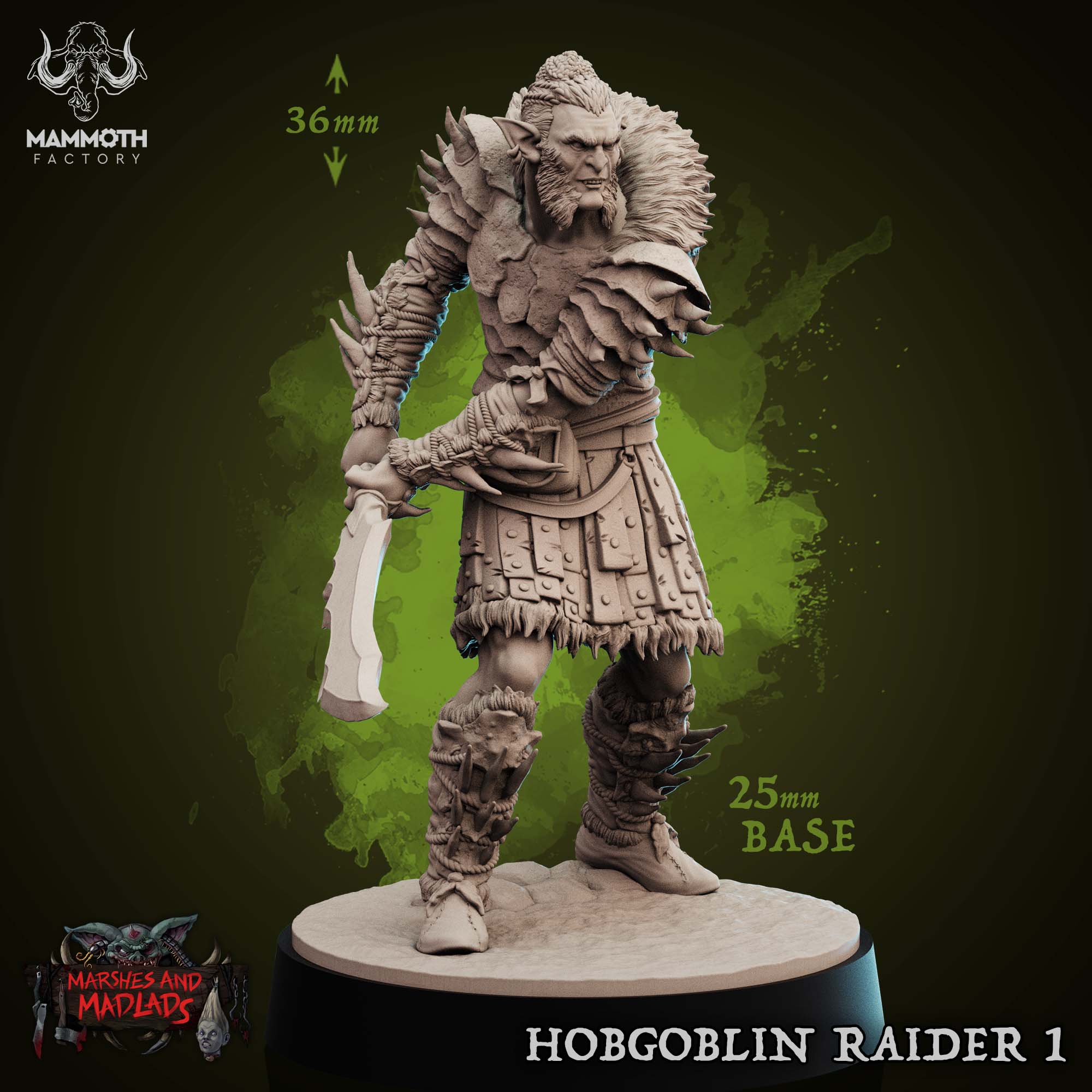 Introduce a formidable adversary to your tabletop adventures with Hobgoblin Raider 1 from Mammoth Factory’s Marshes & Madlads collection. This highly detailed 3D printable miniature captures the menacing presence of a hobgoblin warrior, ready to ambush unsuspecting adventurers. Clad in rugged, bone-spiked armor and a heavy fur mantle, this raider is equipped for brutal swamp skirmishes. The dynamic pose and intricate details, from the texture of the hide to the edge of the large falchion-like blade, make it a standout piece for any collector or player.