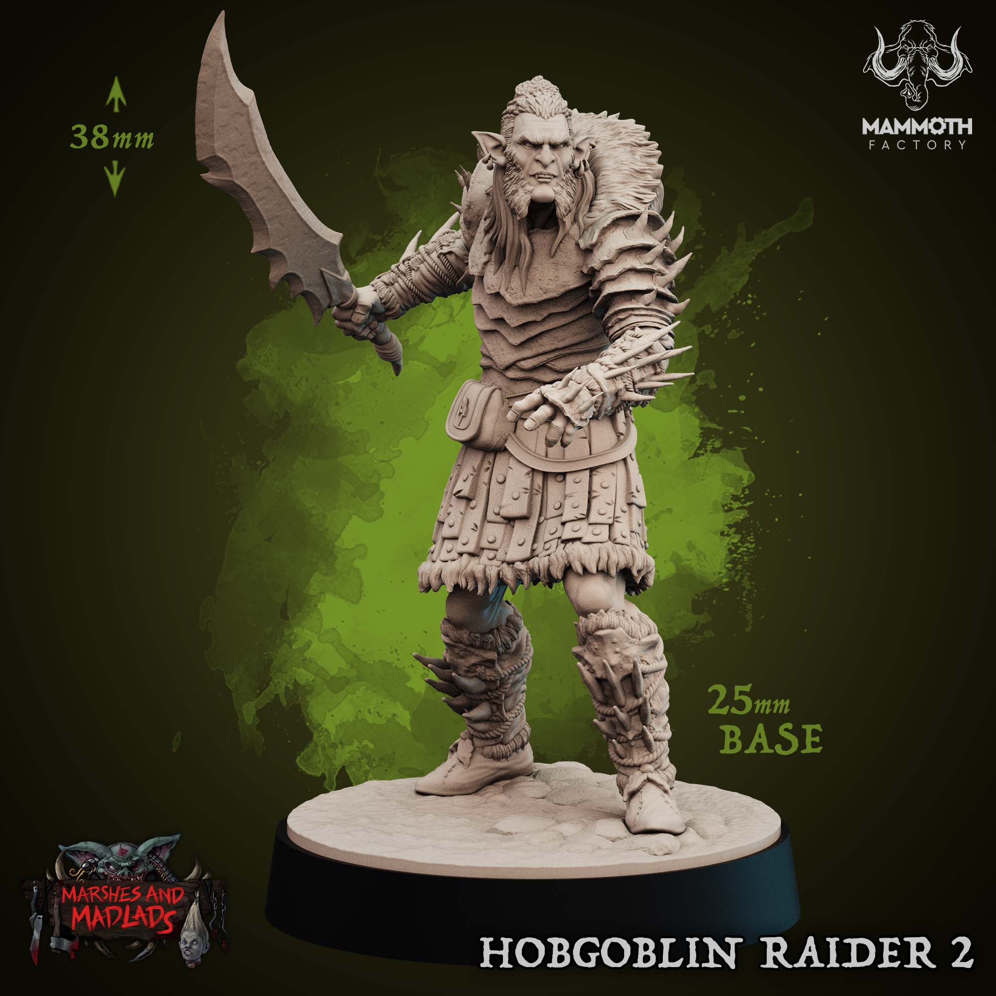 The Hobgoblin Raider 2 is a stunningly detailed miniature designed by Mammoth Factory as part of the Marshes & Madlads collection. This dynamic sculpt captures a fierce Hobgoblin warrior in mid-stride, ready to strike. The attention to detail is exceptional, from the textured leather armor and spiked bracers to the jagged edge of his imposing blade. Whether you need a formidable foe for your players or a unique character for your warband, this miniature will command attention on any gaming table.