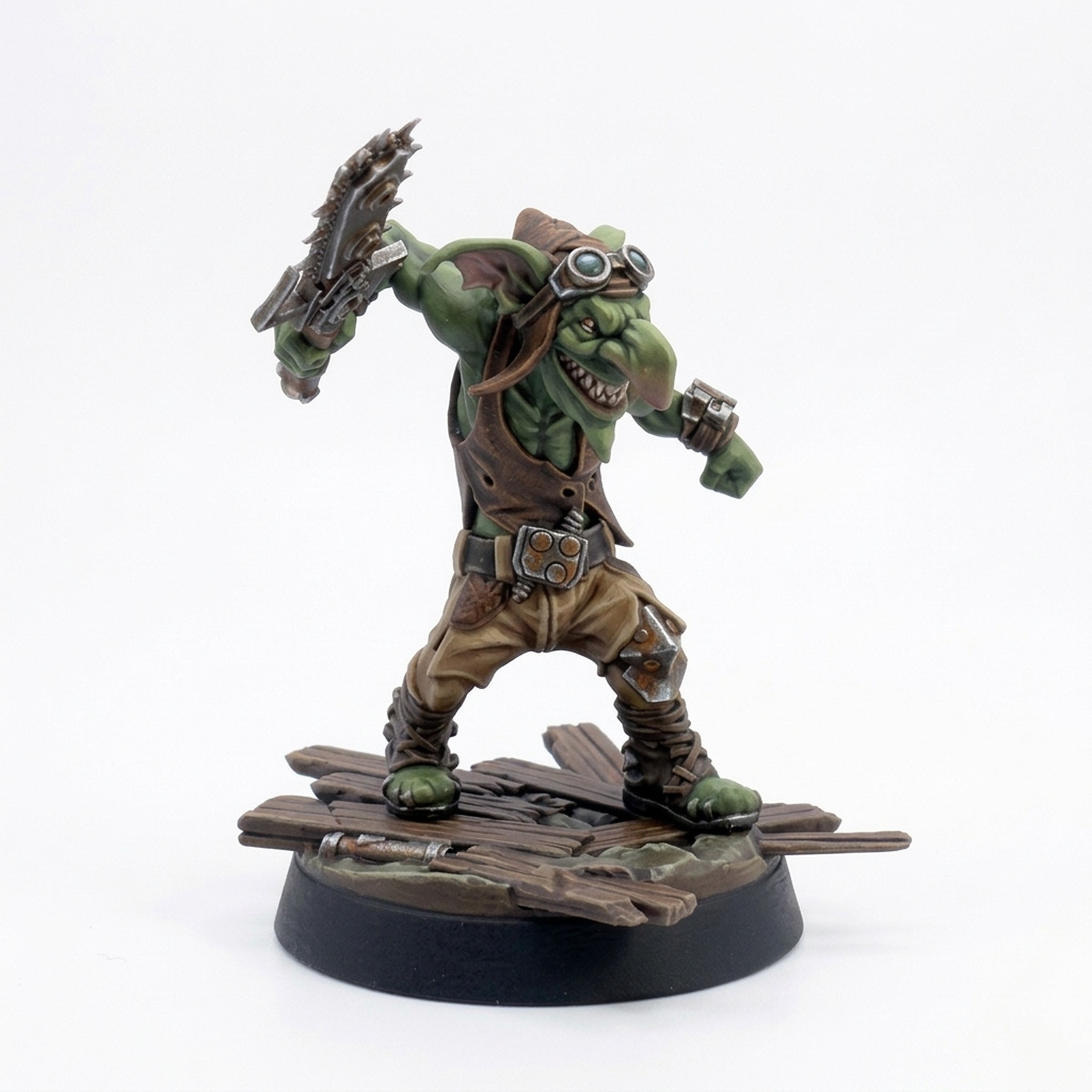 This miniature is perfect for representing a crazed barbarian, an unpredictable rogue, or simply a particularly zealous goblin warrior in your Dungeons & Dragons, Pathfinder, or other fantasy war games. The intricate details of the ramshackle weapon and the chaotic attire provide an excellent canvas for miniature painters looking to showcase their skills with weathered metallic effects, grimy textures, and expressive skin tones. Don't let your convoy leave without this agent of chaos!