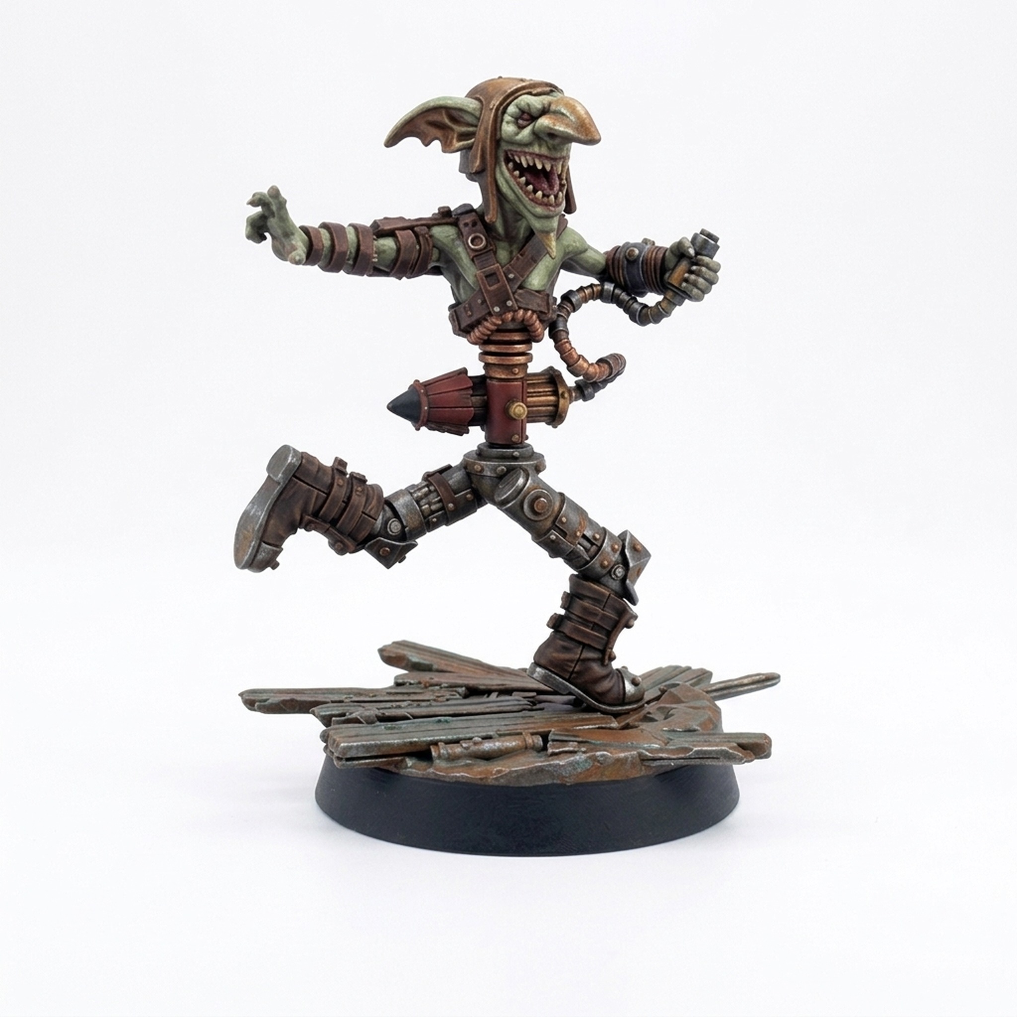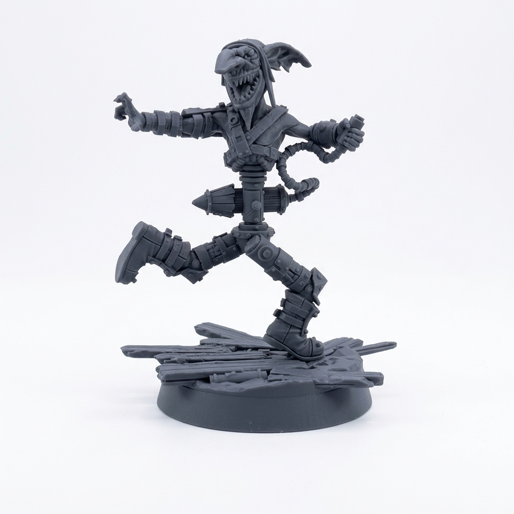 This high-detail resin miniature is perfect for representing a chaotic tinkerer, a suicidal saboteur, or simply adding some unpredictable goblinoid flavor to your encounters. Collectors and painters will appreciate the sharp details, from the strapped-on rocket engine and trailing cables to the goblin's manic expression and ragtag gear. It's a fantastic canvas for weathered metals, glowing rocket effects, and classic goblin skin tones.