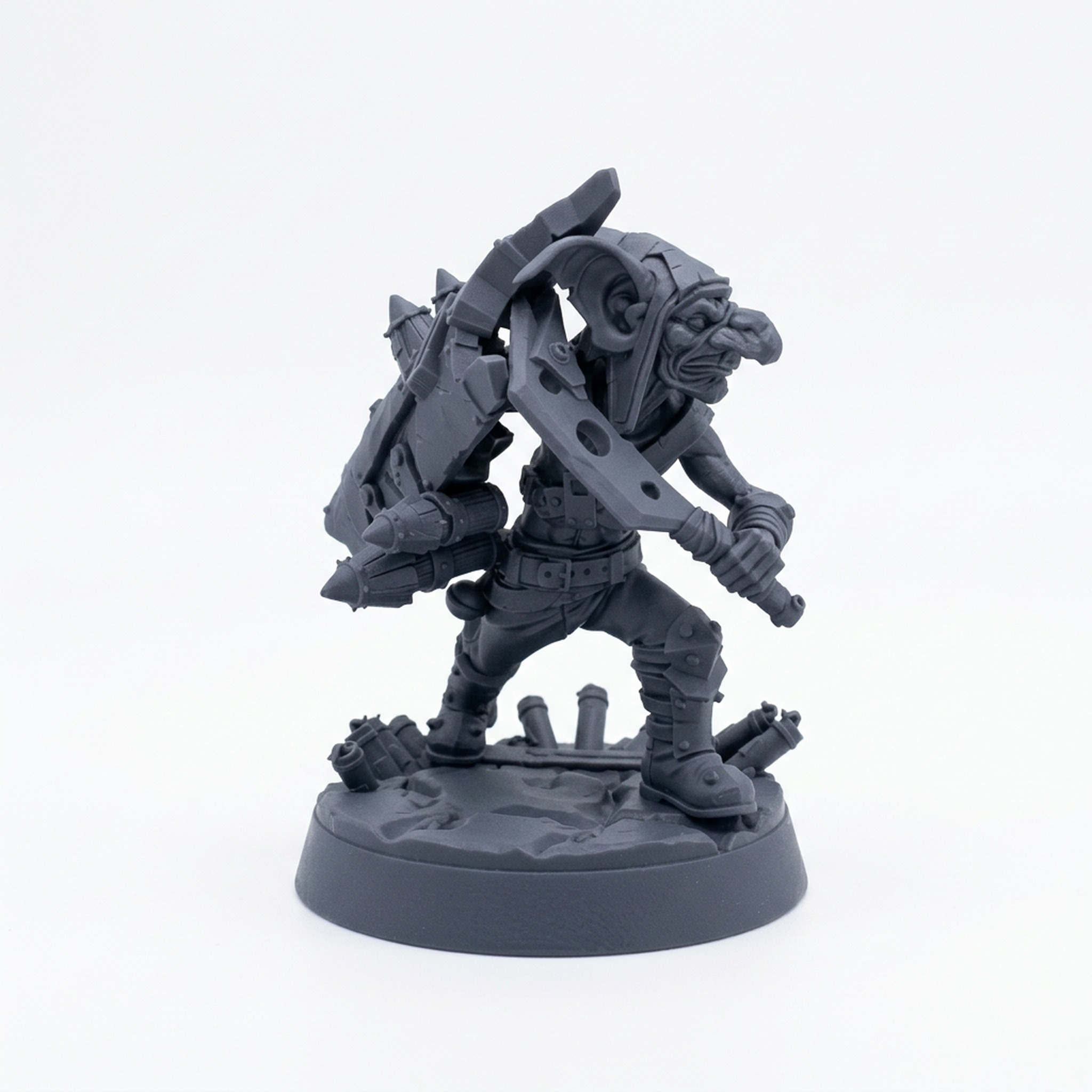 Tosser G – Shield n Stab features a cunning and battle-hardened goblin, armed with an oversized, rocket-powered shield and a sharp blade, ready to defend and strike with brutal efficiency. This 3D-printed miniature depicts a goblin warrior in an aggressive, defensive stance, using his makeshift rocket shield as both protection and a weapon of destruction. His other hand grips a jagged, oversized dagger, perfect for swift, lethal attacks. The intricate details of the shield, complete with bolts, gears, and the unmistakable goblin ingenuity, make this model stand out on any tabletop. The goblin’s armor, constructed from scrap metal and bits of machinery, gives him a gritty, resourceful look. The model stands on a base strewn with debris, adding to the scene of chaotic combat. Tosser G – Shield n Stab is ideal for players who want a unique, tough character capable of both defense and devastating offense. Painters will enjoy the opportunity to bring out the textures of the shield, armor, and detailed base, while gamers will appreciate the dynamic pose and multi-functional weaponry. This figure is perfect for adding a strategic, unpredictable goblin to your campaigns.