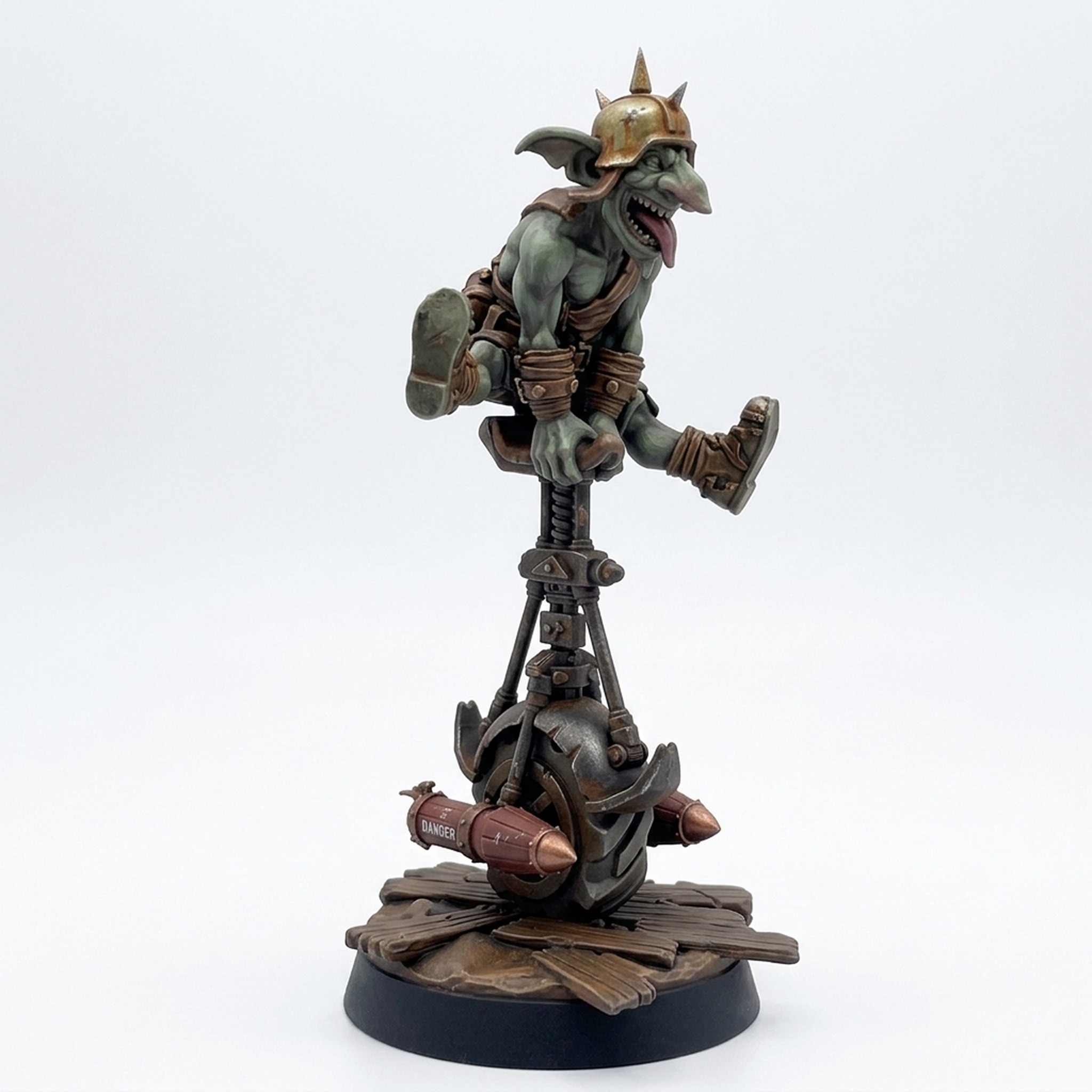 Inject some chaotic energy into your next tabletop session with this incredibly characterful miniature! From 'The Goblin Convoy' collection by the maestros at CastnPlay, this is Unicycle Pose B, affectionately known as 'Wild Wheelin Split'. The sculpt captures a wild goblin performing an insane leg split while precariously balanced atop a jagged, junk-built unicycle. The detail on this single piece is astounding, from the manic expression on the goblin's face and his spiked helmet to the jury-rigged contraption he rides, complete with a strapped barrel and wooden plank base debris.