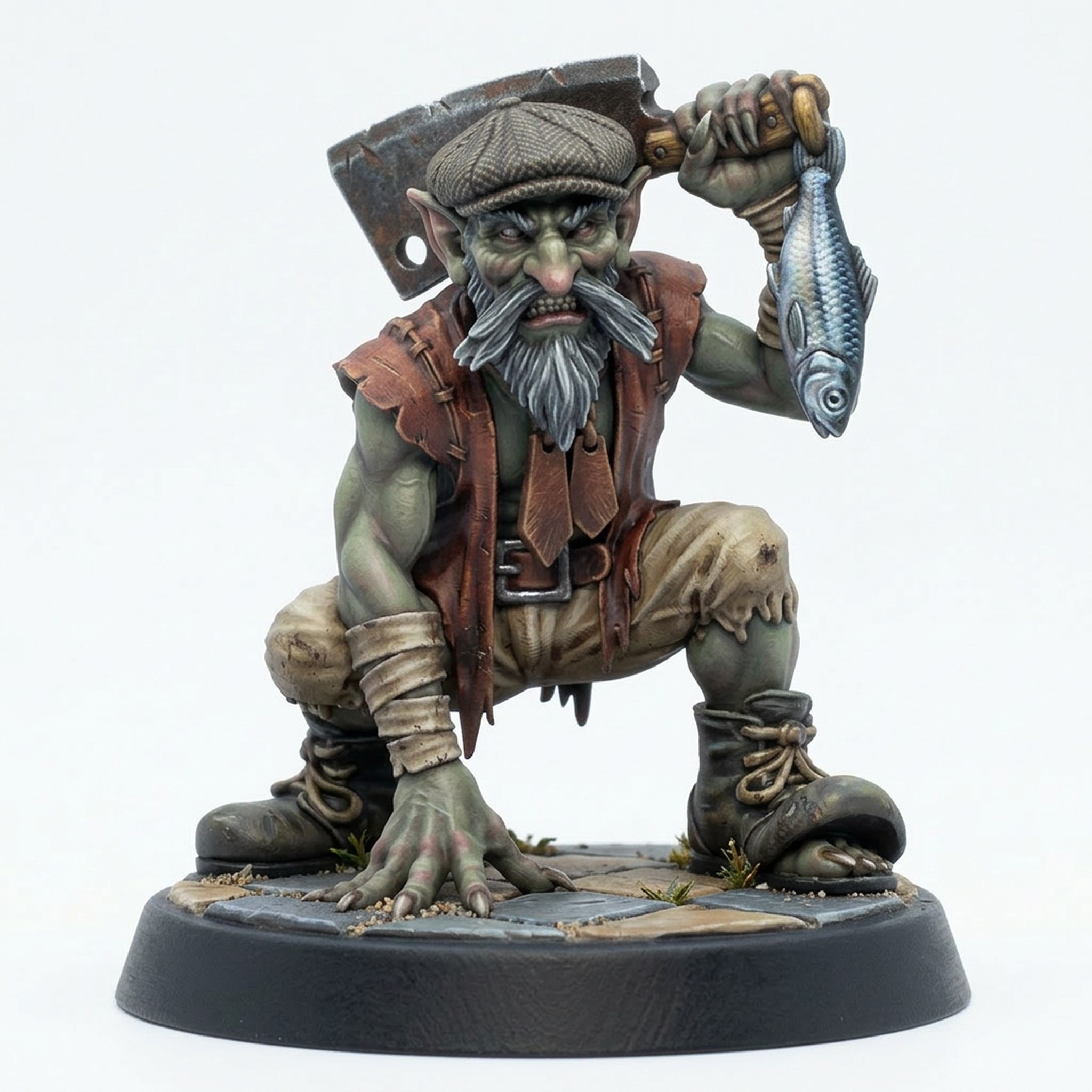 Bring unpredictable chaos to your next tabletop session with Mad Capper 2 from Mammoth Factory’s acclaimed Maze of Madness collection. This meticulously sculpted miniature captures a grizzled, slightly unhinged character in a dynamic crouching pose. He features a distinctive flat cap, a large, ragged beard, and carries both a massive meat cleaver and a chain-linked fish, hinting at a background of chaotic urban survival or perhaps a truly bizarre profession. The level of detail from the tattered clothing to the runic necklaces is exceptional, providing an excellent canvas for miniature painters looking to showcase their skills with texture and characterful expression.
