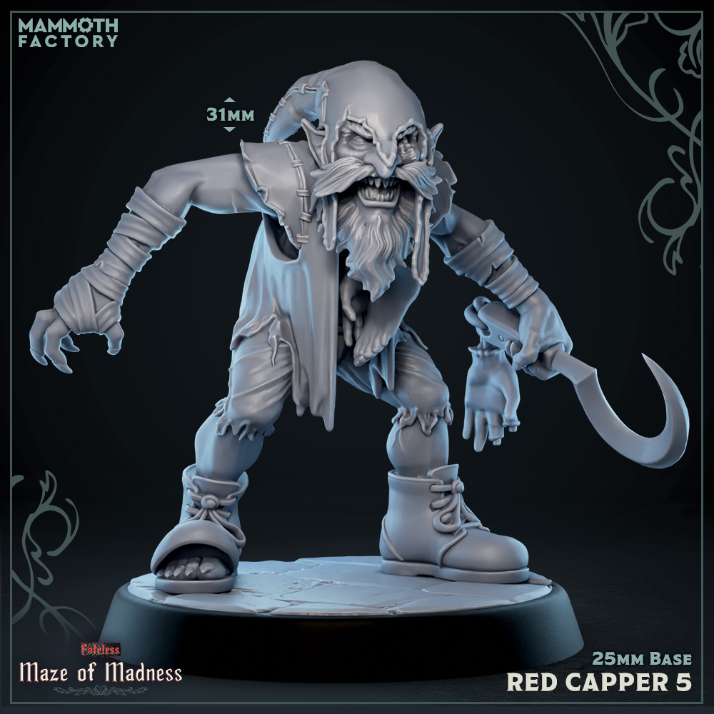 Unleash a malevolent force onto your tabletop with Red Capper 5 from the chilling Maze Of Madness collection by Mammoth Factory. This intricately sculpted miniature perfectly captures the sinister nature of these murderous fey, featuring a menacing expression, ragged attire, and holding a wicked hook. Whether they are ambushing adventurers in a dark forest or serving a greater evil within a twisted dungeon, this miniature is sure to strike fear into your players.