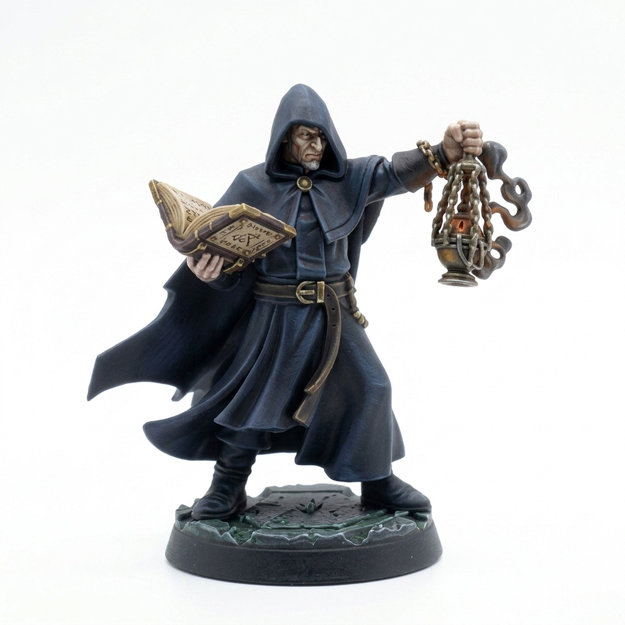 Introduce an air of devotion and knowledge to your next tabletop RPG session with the Acolyte A miniature from the grim Decaying Royal Family collection by CastnPlay. This finely sculpted figure captures a moment of intense concentration, with the acolyte intently reading from an open tome while holding aloft a flickering lantern. The details, from the texture of his hooded robes to the bindings of the book and the intricate lantern, are rendered with incredible precision, making it a joy for any miniature painter to work on.