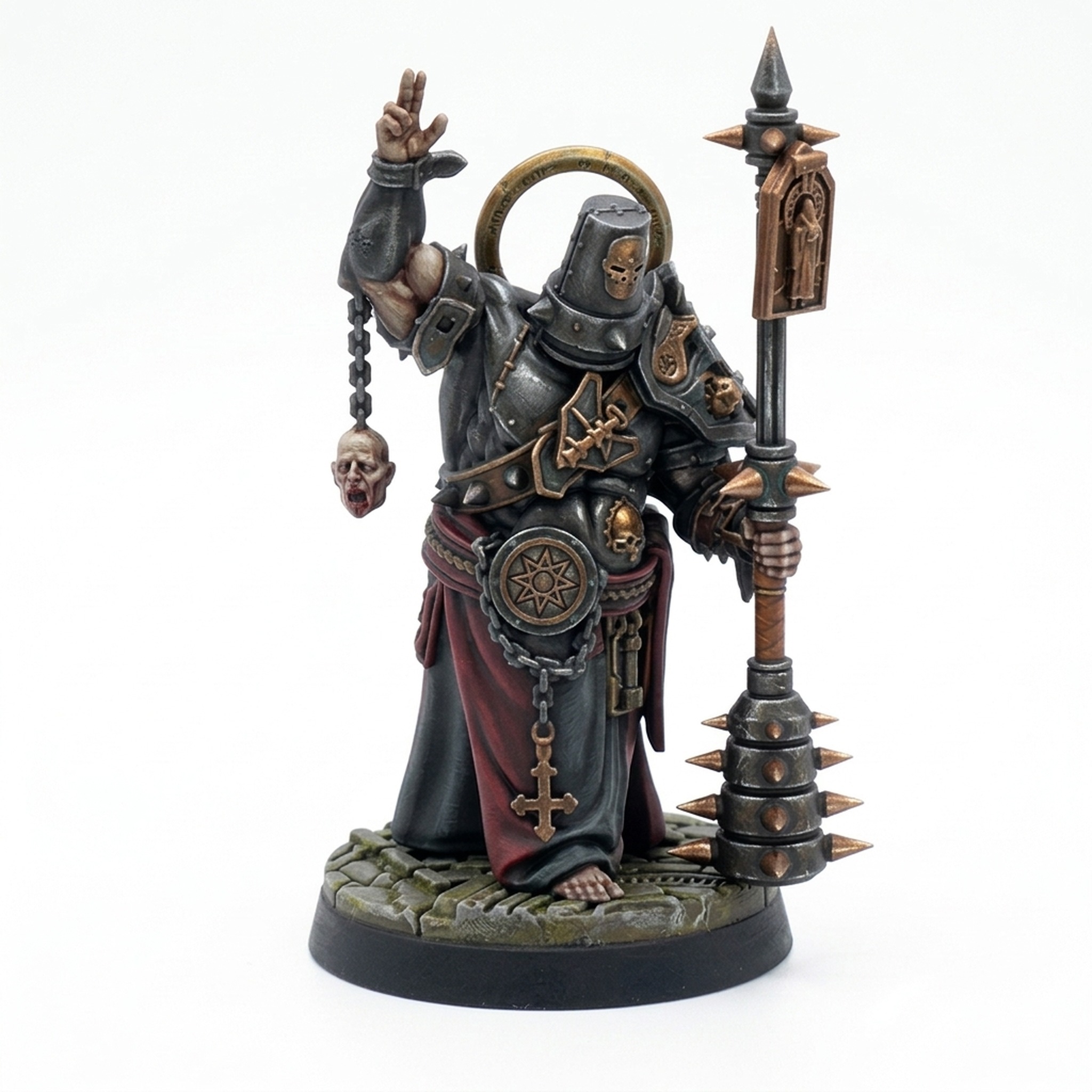 Every element of this sculpt is crafted with care, from the heavy-set, armored body and flowing robes to the intricate details of the iconic iron halo and hanging relics. This miniature is perfect for representing powerful cult leaders, zealous clerics, or even unique monsters in your D&D sessions, Warhammer games, or any other fantasy setting where a touch of dark piety is required. Your players will immediately understand the threat this figure presents.