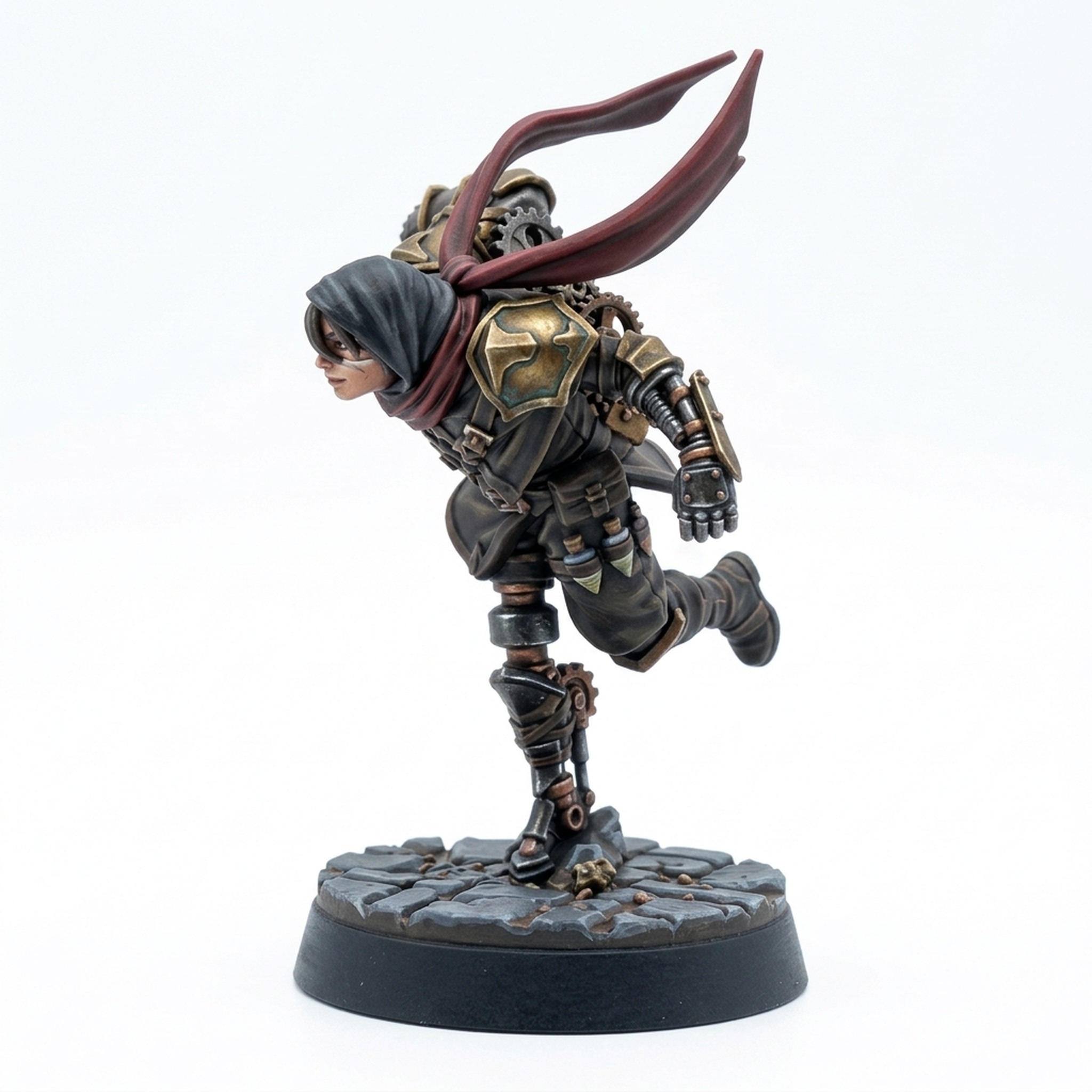 Crafted with extraordinary detail, this miniature is an exceptional canvas for painters. The varied textures—from the fabric of the hood and flowing scarf to the detailed mechanism of the steampunk mechanical limb—offer opportunities for creative techniques with metallics, washes, and layering. Its dynamic pose makes it an eye-catching centerpiece on any battlefield, ideal for representing a speedy monk, a mechanical-minded fighter, or a deadly agile rogue. This isn't just a miniature; it's a dynamic storytelling element for your tabletop adventures.