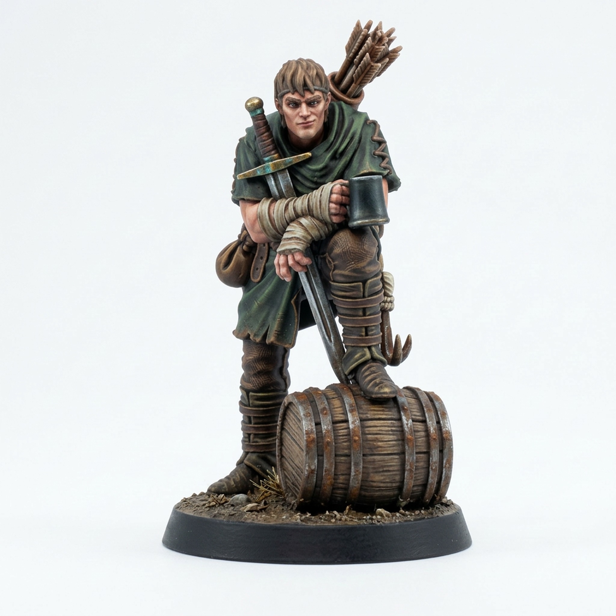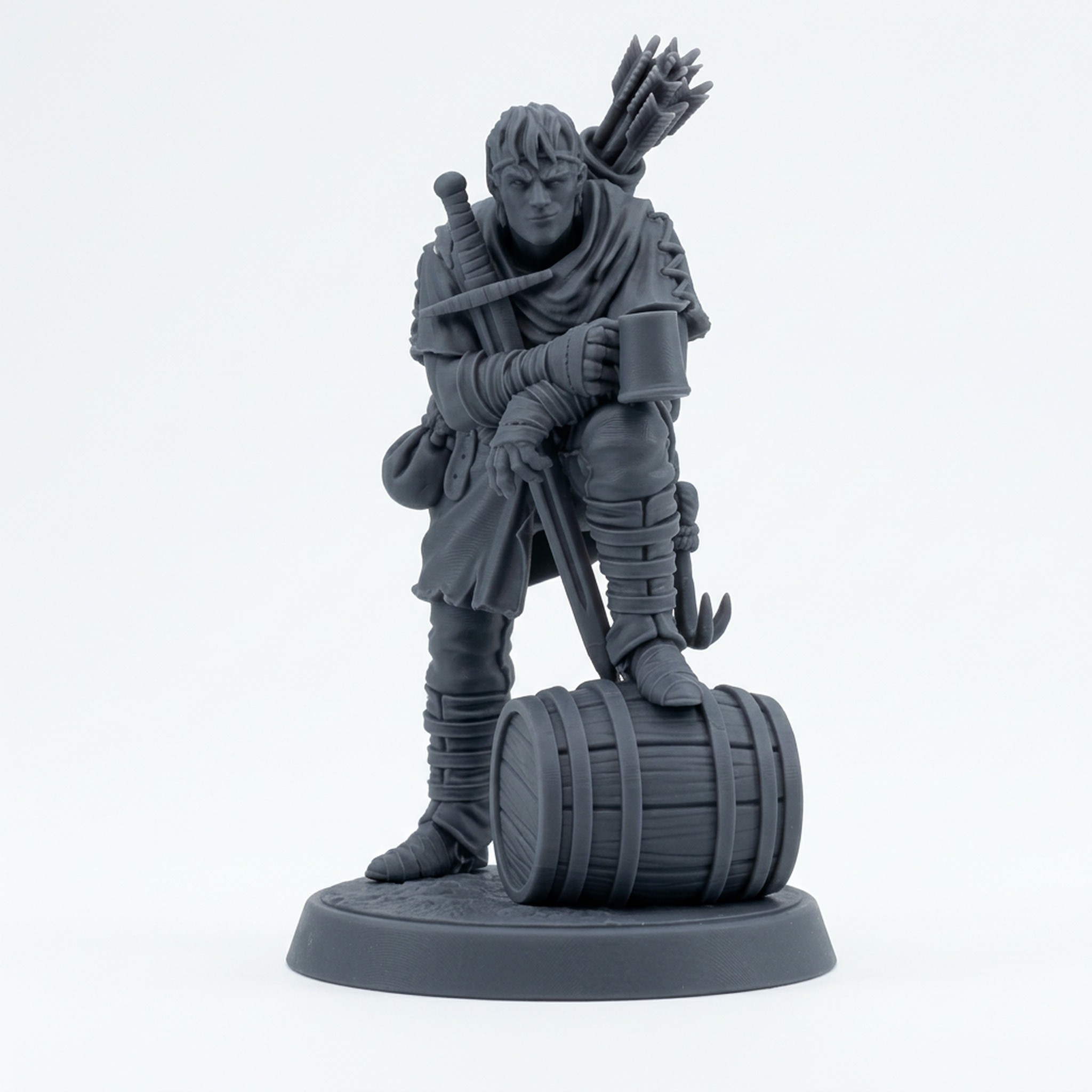 Add a touch of roguish charm to your next tabletop adventure with the Cutthroat Bandit 5 miniature from Mamoth Factory. This incredibly detailed 3D printed resin model, part of the Roadside collection, captures a rugged outlaw leaning casually on a barrel, tankard in hand. The sculpt is packed with character, featuring layered clothing, a quiver of arrows on his back, a sheathed greatsword at his side, and a cocky smirk. This isn't just a generic bandit; this is a character waiting for a story.