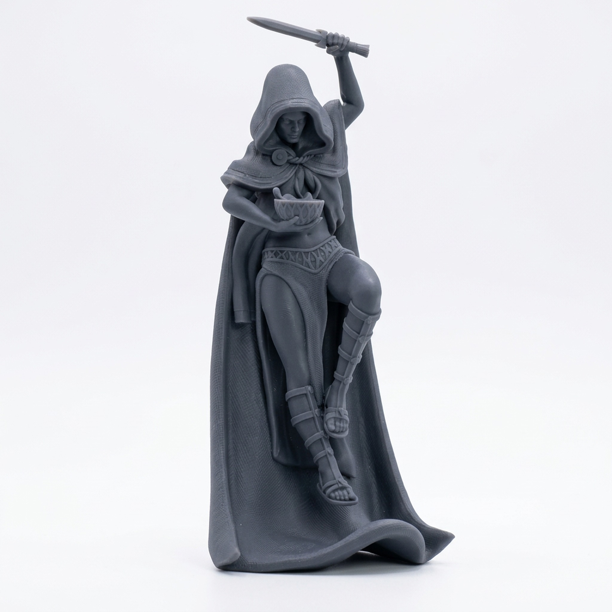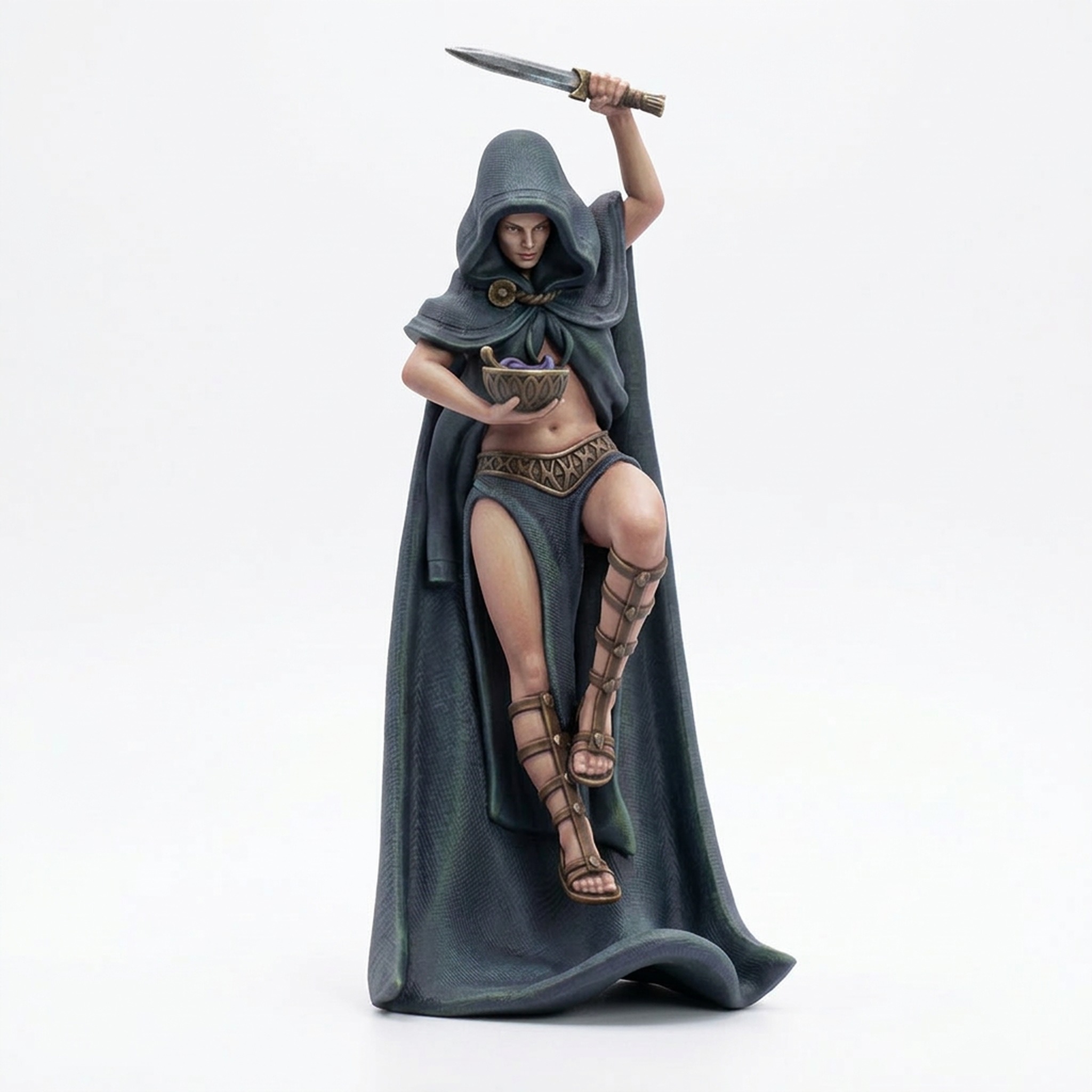 This resin miniature is a testament to quality sculpts. Every element, from the flow of her cloak and hood to the intricate patterns on her tunic and the straps of her sandals, is rendered with incredible precision. The textured base adds another layer of realism, making it a perfect piece for both painters and gamers. This figure offers unparalleled detail that will stand out on any gaming table, whether she’s a mysterious assassin, a rogue, or a dark cultist.