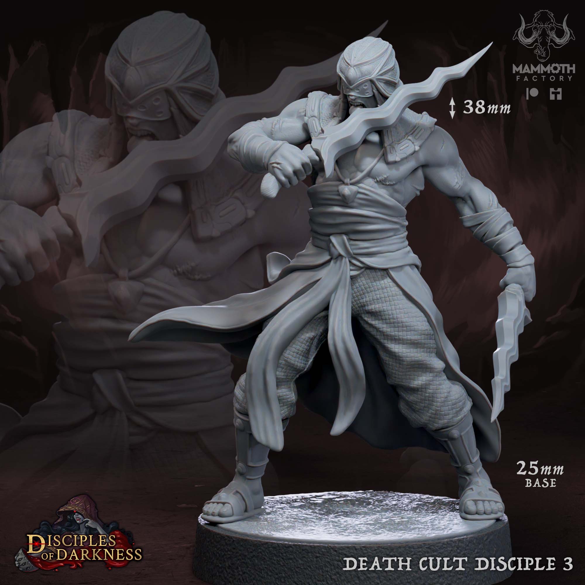 Embody the unyielding fervor of the Disciples of Darkness with the **Death Cult Disciple 3** miniature. This dynamic sculpt captures a fanatic in a powerful combat pose, wielding a formidable wavy greatsword with two hands and another jagged dagger on his belt. Clad in wrapped armor, billowing robes, and a intimidating face mask, every inch of this model is packed with character and narrative potential for your next tabletop encounter. Whether serving as a zealot for a dark god or a dangerous foe for your adventuring party, this disciple is ready to make his mark.