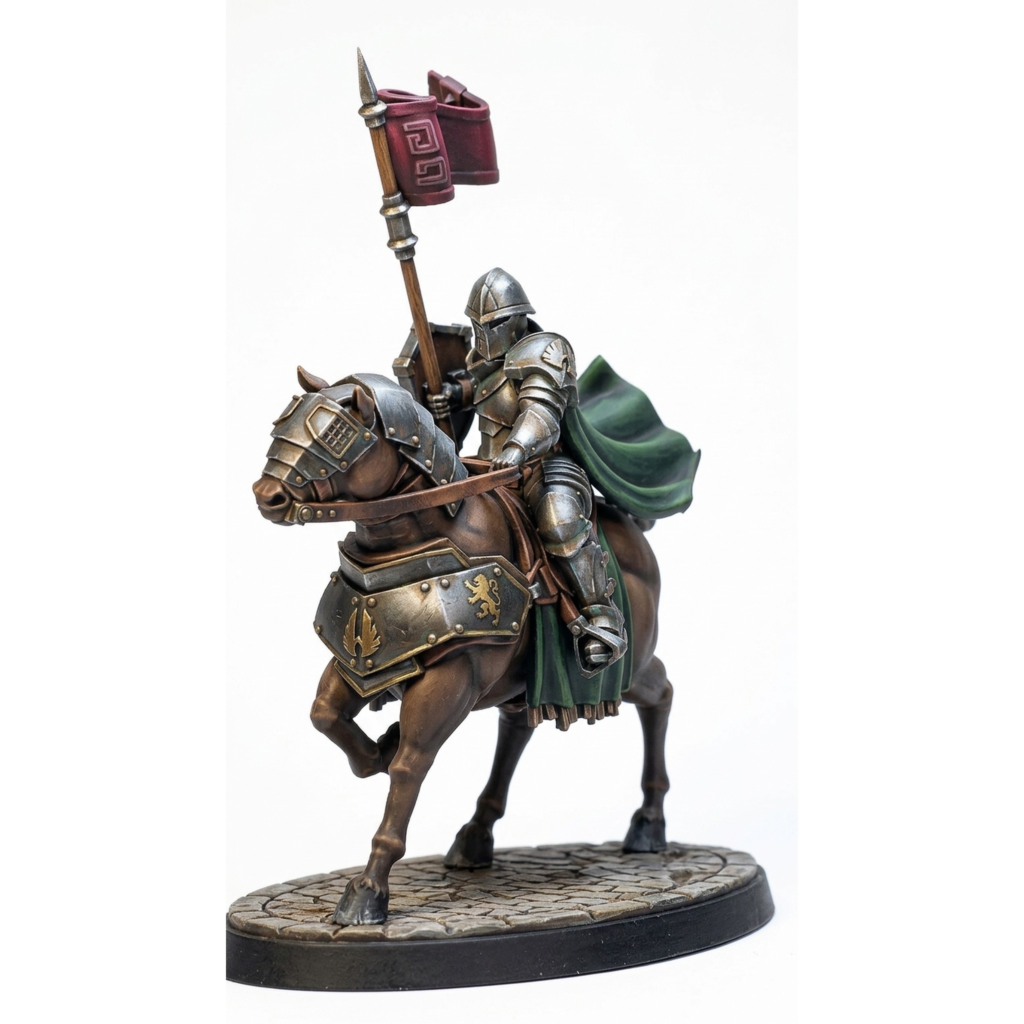 Introduce a noble defender to your tabletop with Emile Lancebreaker, a stunningly detailed mounted knight miniature from the acclaimed City Guards collection by CastnPlay. Fully armored from helm to hoof, this model perfectly captures the imposing presence of heavy cavalry. Emile sits astride a powerful warhorse protected by barded armor, raising a tall banner aloft, ready to signal the charge and inspire his troops. The intricate sculpting on the plate armor, the flowing cloak, and the details of the horse tack make this a standout piece for any collector or player.