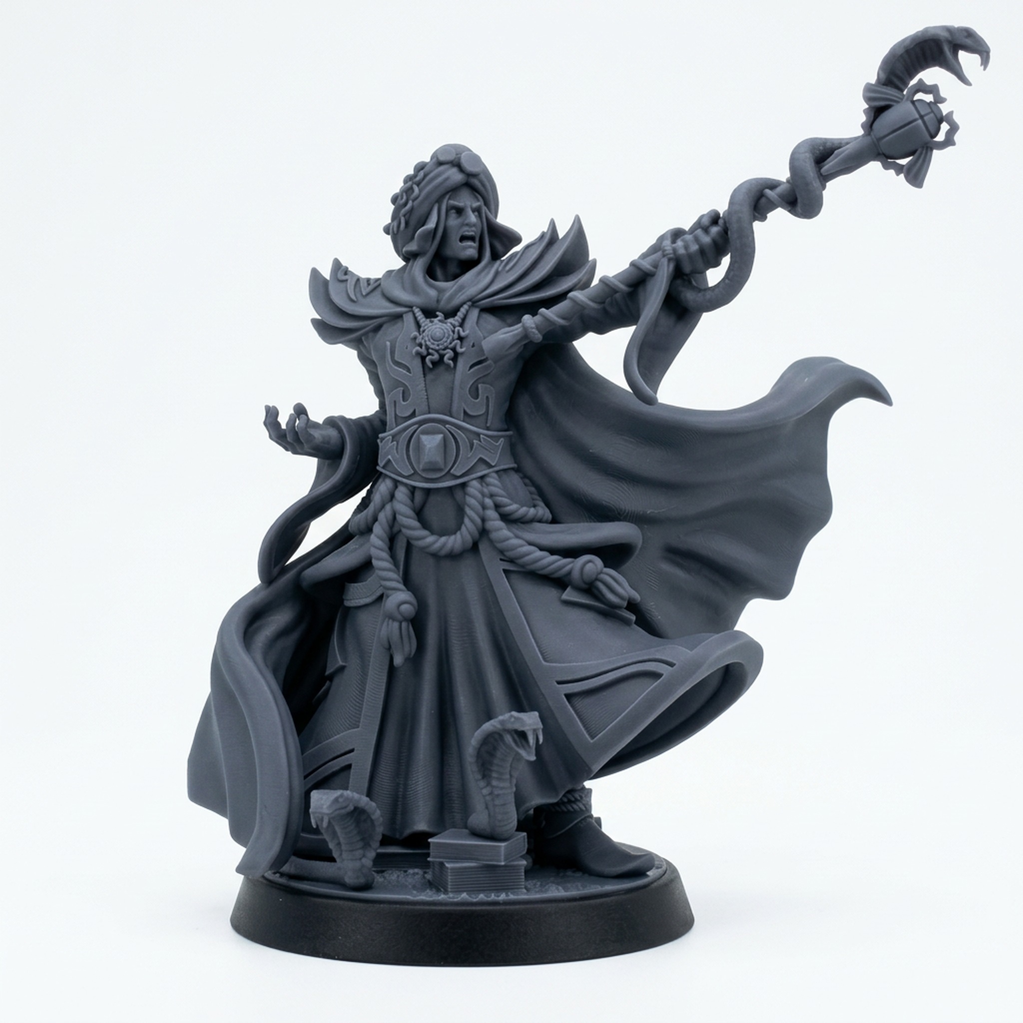 Painters will relish the opportunity to bring out the details on his ornate clothing, elaborate staff, and slithering companions. The crisp details and sharp edges of this high-quality 3D printed resin miniature ensure a superb painting experience and a stunning result for display or gameplay.