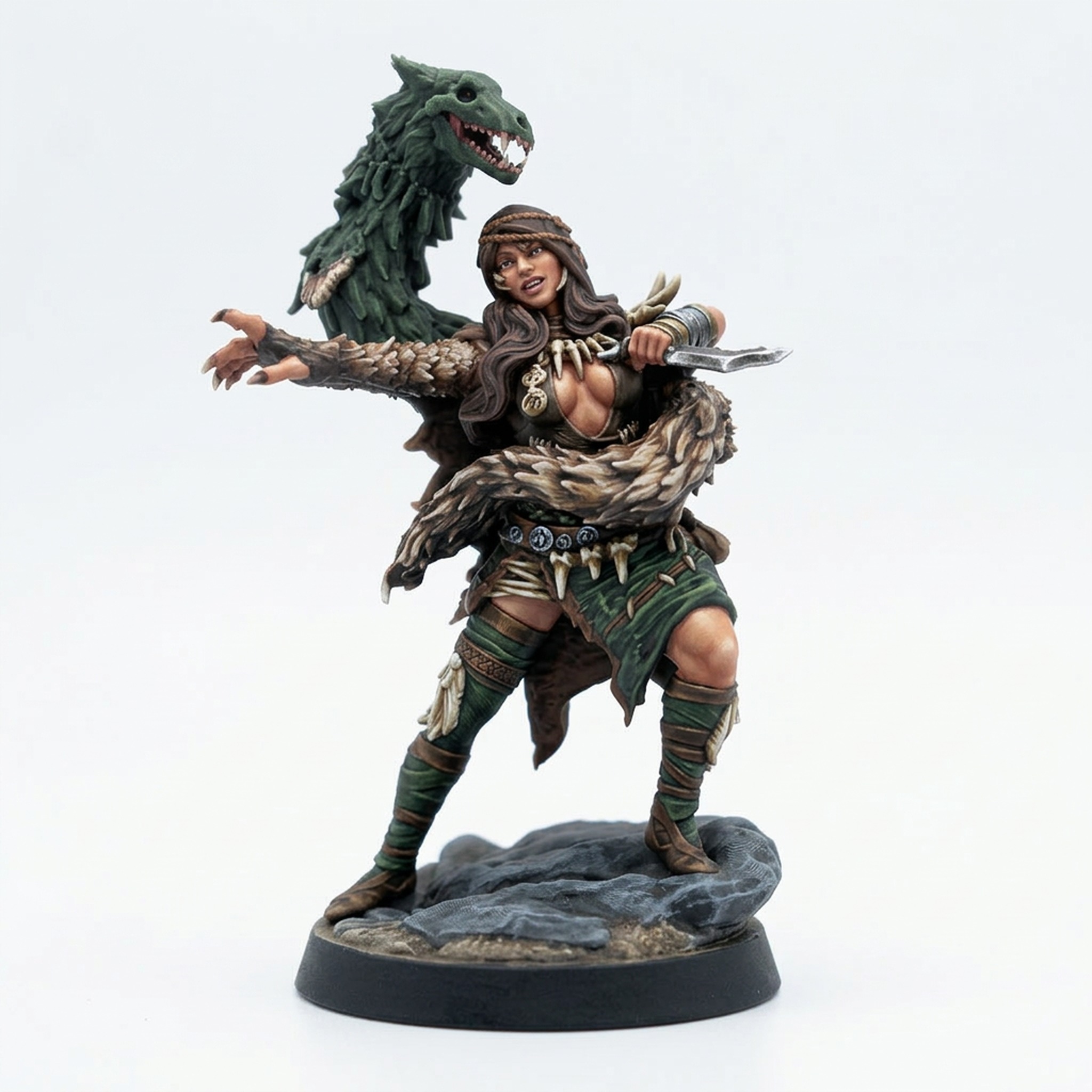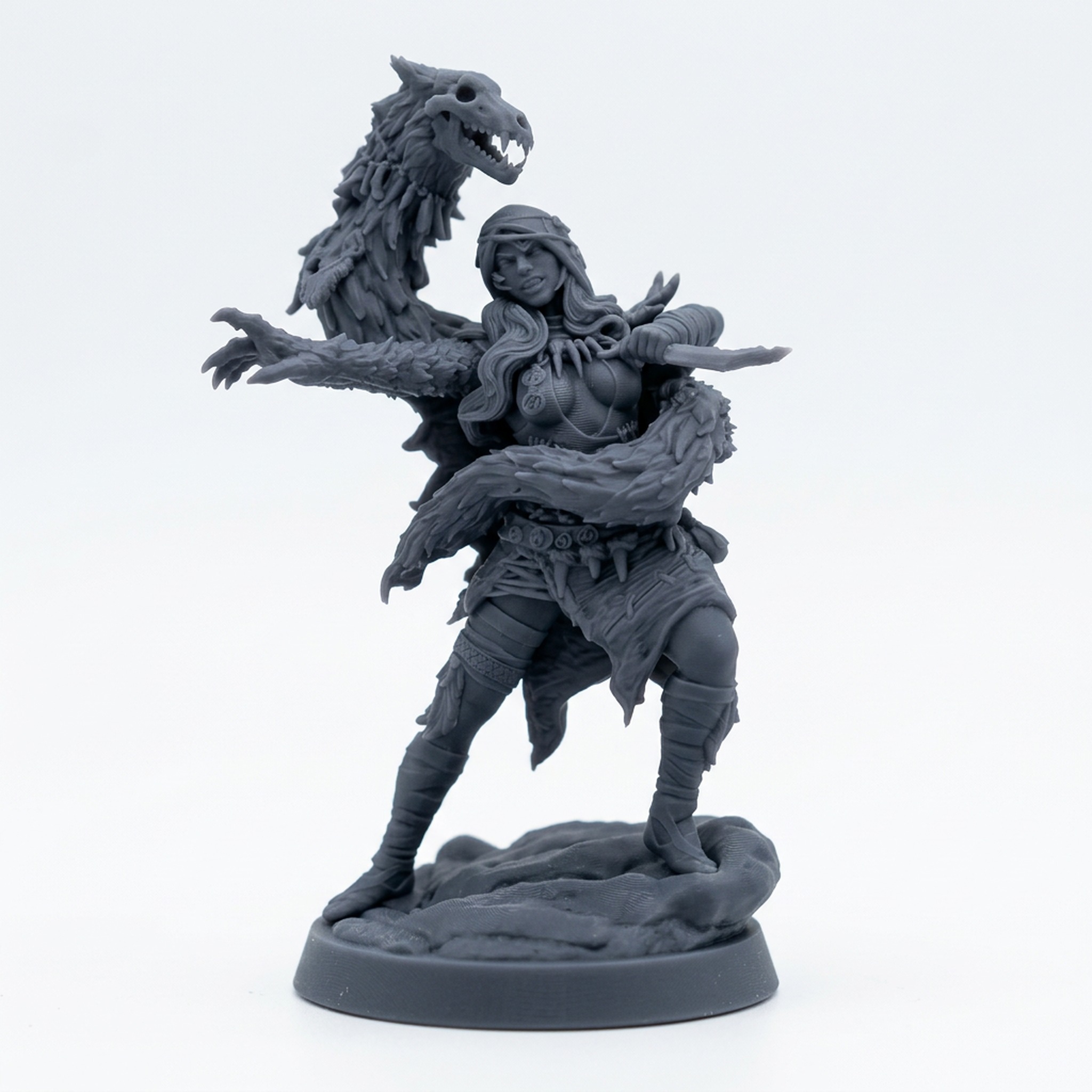Unleash the primal fury of the north with the Klyma Wraithweaver, a standout miniature from the Frostwilds 2 collection by Mammoth Factory. This stunning sculpt captures Klyma in a dynamic pose, her body adorned with rugged furs and intricate bone trophies that speak of her strength and survival in the harsh, frozen wilds. Clutching a jagged dagger and reaching forward with a clawed gauntlet, she channels ancient spirit magic, with the spectral head of a great beast manifesting behind her. The detail is unparalleled, from the textures of her braided hair to the individual links of her bone necklace, making this a truly memorable centerpiece for your tabletop adventures.