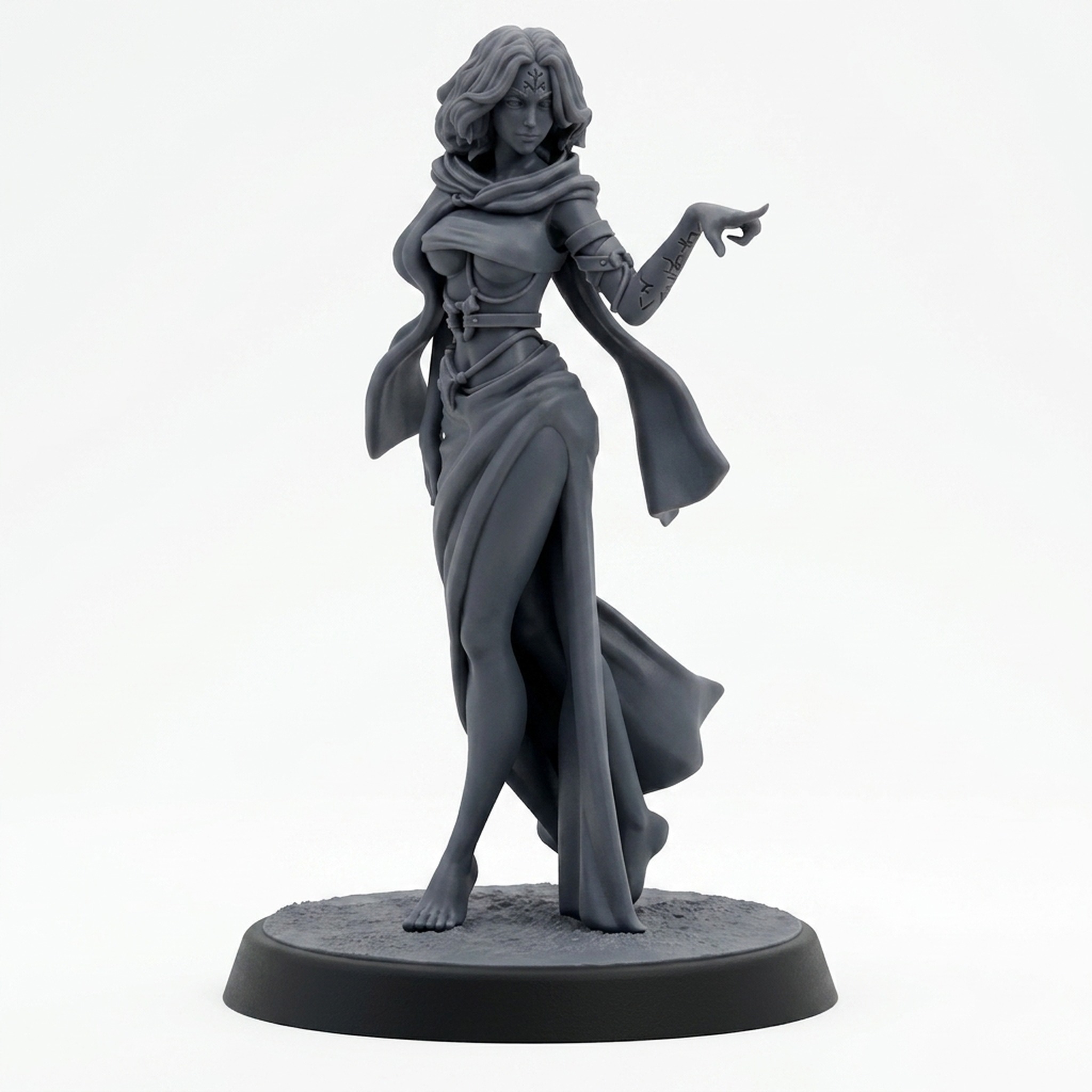 Crafted for discerning painters and players, this 3D printed miniature showcases exceptional detail, from the delicate folds of her garments to the sharp definition of the runes on her arm and forehead. She stands confidently on a textured base, ready to be unleashed in any fantasy RPG setting, whether as an enigmatic ally, a cunning villain, or a player character seeking forbidden knowledge.