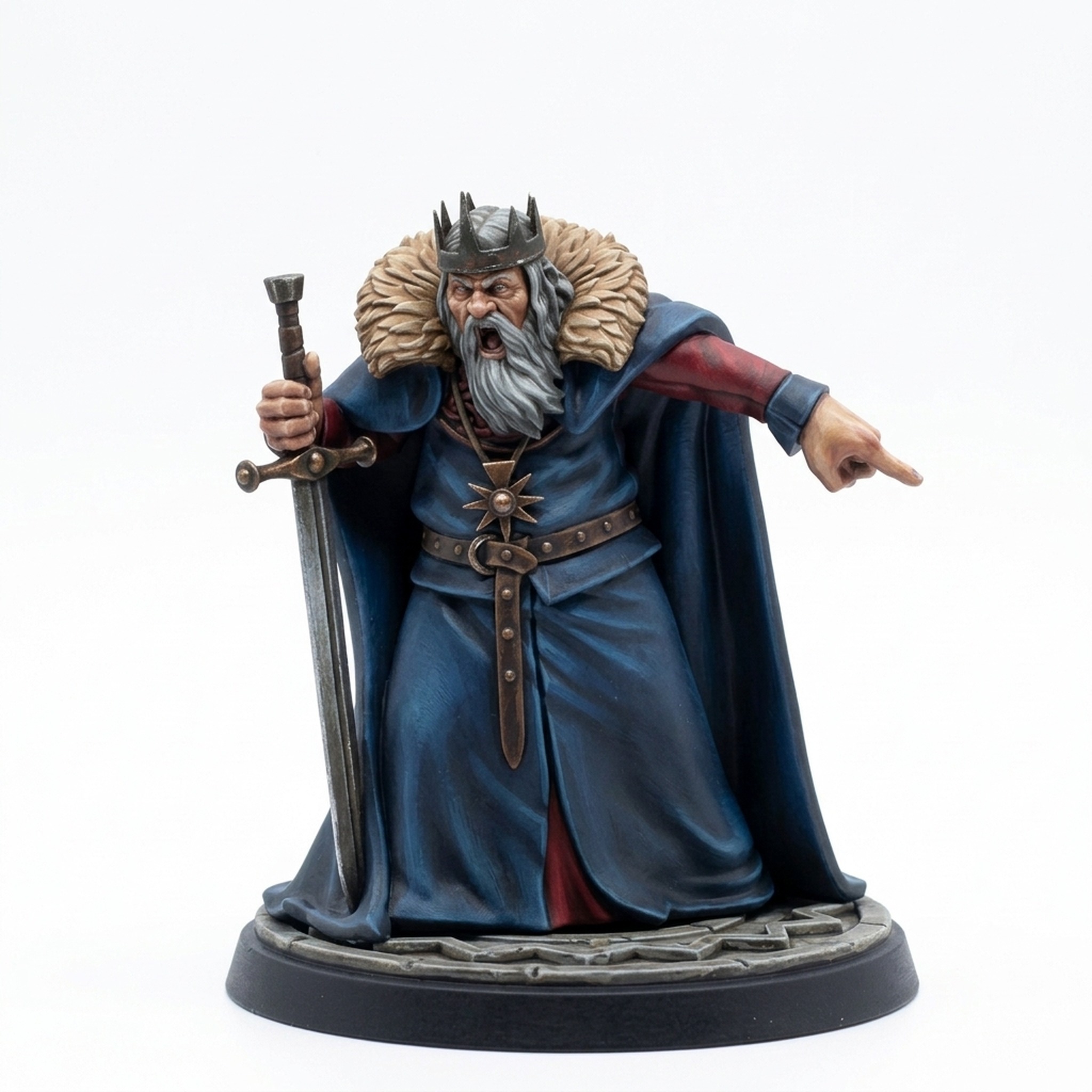 Painters will appreciate the deep textures and clear definition that allow for various techniques, from vibrant, regal colors to grimy, neglected tones. His imposing presence, complete with a flowing fur-lined cloak and intricate crown, makes him an excellent centerpiece for encounters. Perfect for Dungeons and Dragons, Pathfinder, or any fantasy wargame needing a character of significance and madness.
