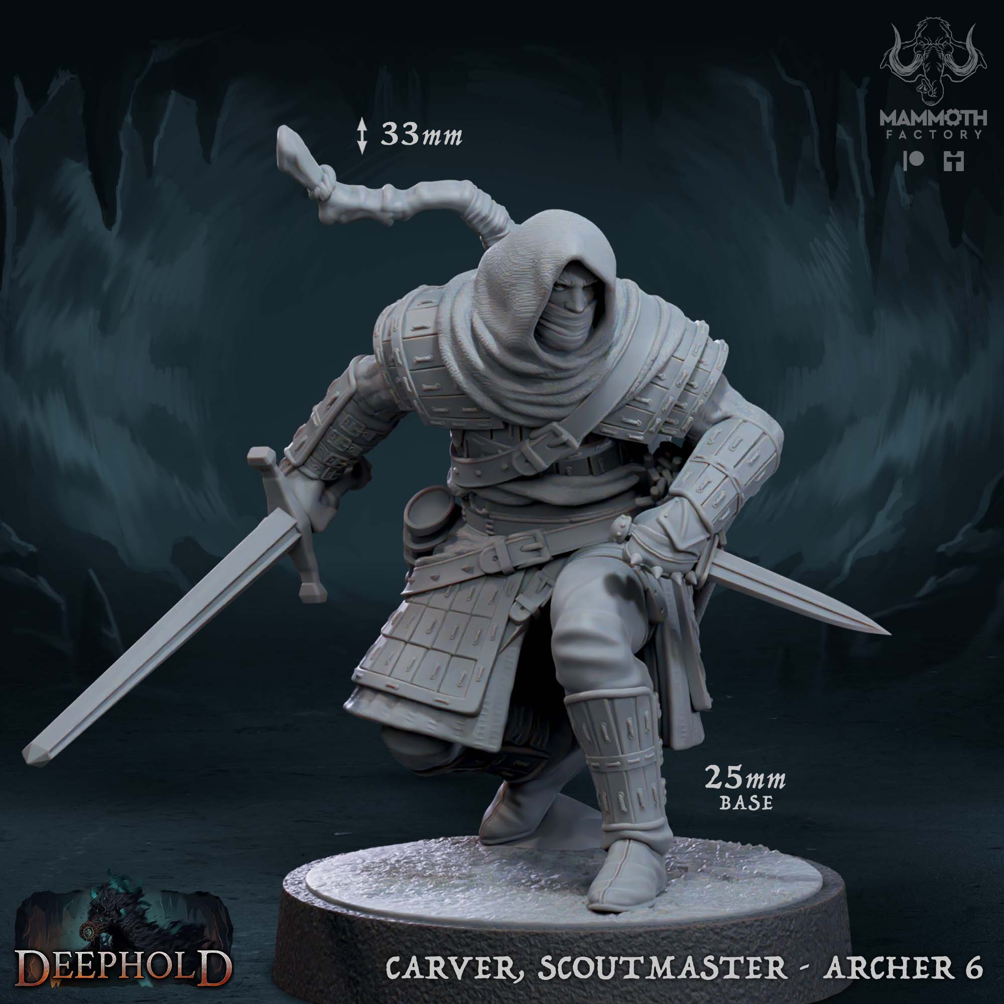 Bring shadow and steel to your tabletop with the Oathsworn Archer 6 miniature from the DeepHold collection by Mammoth Factory. This highly detailed sculpt captures a hooded warrior in a dynamic, low-crouch pose, ready to strike. Dressed in intricate lamellar armor that offers both protection and flexibility, this model embodies the clandestine nature of a scoutmaster. Although titled an archer, this particular warrior is masterfully depicted wielding a sword and a vicious-looking dagger, perfectly capturing a rogue, assassin, or ranger who has closed the distance for close-quarters combat. The detailed hood and face mask add an element of mystery and deadly intent that will look fantastic on any gaming table.
